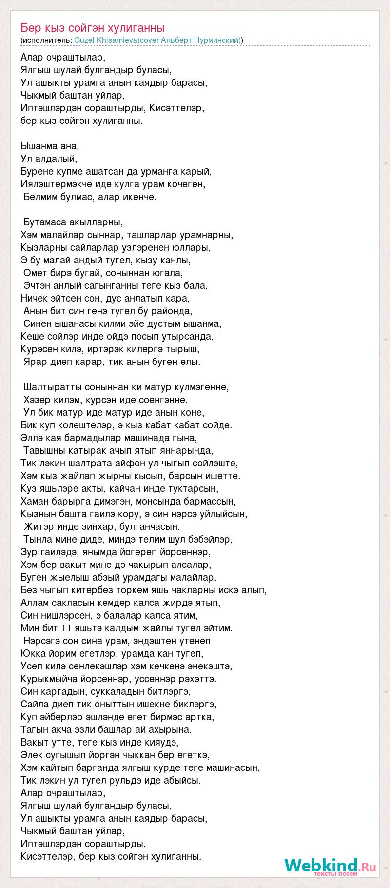 Алар очраштылар, Ялгыш шулай булгандыр буласы, Ул ашыкты урамга анын каядыр барасы, Чыкмый баштан уйлар, Иптэшлэрдэн сораштырды, Кисэттелэр, бер кыз сойгэн хулиганны. Ышанма ана, Ул алдалый, Бурене купме ашатсан да урманга карый, Иялэштермэкче иде кулга урам кочеген, Белмим булмас, алар икенче. Бутамаса акылларны, Хэм малайлар сыннар, ташларлар урамнарны, Кызларны сайларлар узлэренен юллары, Э бу малай андый тугел, кызу канлы, Омет бирэ бугай, соныннан югала, Эчтэн анлый сагынганны теге кыз бала, Ничек эйтсен сон, дус анлатып кара, Анын бит син генэ тугел бу районда, Синен ышанасы килми эйе дустым ышанма, Кеше сойлэр инде ойдэ посып утырсанда, Курэсен килэ, иртэрэк килергэ тырыш, Ярар диеп карар, тик анын буген елы. Шалтыратты соныннан ки матур кулмэгенне, Хэзер килэм, курсэн иде соенгэнне, Ул бик матур иде матур иде анын коне, Бик куп колештелэр, э кыз кабат кабат сойде. Эллэ кая бармадылар машинада гына, Тавышны катырак ачып ятып яннарында, Тик лэкин шалтрата айфон ул чыгып сойлэште, Хэм кыз жайлап жырны кысып, барсын ишетте. Куз яшьлэре акты, кайчан инде туктарсын, Хаман барырга димэгэн, монсында бармассын, Кызнын башта гаилэ кору, э син нэрсэ уйлыйсын, Житэр инде зинхар, булганчасын. Тынла мине диде, миндэ телим шул бэбэйлэр, Зур гаилэдэ, янымда йогереп йорсеннэр, Хэм бер вакыт мине дэ чакырып алсалар, Буген жыелыш абзый урамдагы малайлар. Без чыгып китербез торкем яшь чакларны искэ алып, Аллам сакласын кемдер калса жирдэ ятып, Син нишлэрсен, э балалар калса ятим, Мин бит 11 яшьтэ калдым жайлы тугел эйтим. Нэрсэгэ сон сина урам, эндэштен утенеп Юкка йорим егетлэр, урамда кан тугеп, Усеп килэ сенлекэшлэр хэм кечкенэ энекэштэ, Курыкмыйча йорсеннэр, уссеннэр рэхэттэ. Син каргадын, суккаладын битлэргэ, Сайла диеп тик оныттын ишекне биклэргэ, Куп эйберлэр эшлэнде егет бирмэс артка, Тагын акча эзли башлар ай ахырына. Вакыт утте, теге кыз инде кияудэ, Элек сугышып йоргэн чыккан бер егеткэ, Хэм кайтып барганда ялгыш курде теге машинасын, Тик лэкин ул тугел рульдэ иде абыйсы. Алар очраштылар, Ялгыш шулай булгандыр буласы, Ул ашыкты урамга анын каядыр барасы, Чыкмый баштан уйлар, Иптэшлэрдэн сораштырды, Кисэттелэр, бер кыз сойгэн хулиганны.