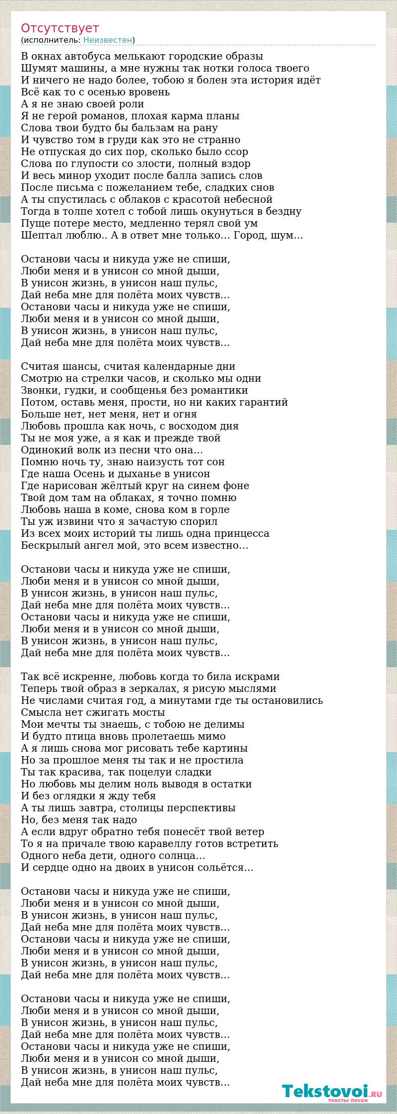В окнах автобуса мелькают городские образы Шумят машины, а мне нужны так нотки голоса твоего И ничего не надо более, тобою я болен эта история идёт Всё как то с осенью вровень А я не знаю своей роли Я не герой романов, плохая карма планы Слова твои будто бы бальзам на рану И чувство том в груди как это не странно Не отпуская до сих пор, сколько было ссор Слова по глупости со злости, полный вздор И весь минор уходит после балла запись слов После письма с пожеланием тебе, сладких снов А ты спустилась с облаков с красотой небесной Тогда в толпе хотел с тобой лишь окунуться в бездну Пуще потере место, медленно терял свой ум Шептал люблю.. А в ответ мне только… Город, шум… Останови часы и никуда уже не спиши, Люби меня и в унисон со мной дыши, В унисон жизнь, в унисон наш пульс, Дай неба мне для полёта моих чувств… Останови часы и никуда уже не спиши, Люби меня и в унисон со мной дыши, В унисон жизнь, в унисон наш пульс, Дай неба мне для полёта моих чувств… Считая шансы, считая календарные дни Смотрю на стрелки часов, и сколько мы одни Звонки, гудки, и сообщенья без романтики Потом, оставь меня, прости, но ни каких гарантий Больше нет, нет меня, нет и огня Любовь прошла как ночь, с восходом дня Ты не моя уже, а я как и прежде твой Одинокий волк из песни что она… Помню ночь ту, знаю наизусть тот сон Где наша Осень и дыханье в унисон Где нарисован жёлтый круг на синем фоне Твой дом там на облаках, я точно помню Любовь наша в коме, снова ком в горле Ты уж извини что я зачастую спорил Из всех моих историй ты лишь одна принцесса Бескрылый ангел мой, это всем известно… Останови часы и никуда уже не спиши, Люби меня и в унисон со мной дыши, В унисон жизнь, в унисон наш пульс, Дай неба мне для полёта моих чувств… Останови часы и никуда уже не спиши, Люби меня и в унисон со мной дыши, В унисон жизнь, в унисон наш пульс, Дай неба мне для полёта моих чувств… Так всё искренне, любовь когда то била искрами Теперь твой образ в зеркалах, я рисую мыслями Не числами считая год, а минутами где ты остановились Смысла нет сжигать мосты Мои мечты ты знаешь, с тобою не делимы И будто птица вновь пролетаешь мимо А я лишь снова мог рисовать тебе картины Но за прошлое меня ты так и не простила Ты так красива, так поцелуи сладки Но любовь мы делим ноль выводя в остатки И без оглядки я жду тебя А ты лишь завтра, столицы перспективы Но, без меня так надо А если вдруг обратно тебя понесёт твой ветер То я на причале твою каравеллу готов встретить Одного неба дети, одного солнца… И сердце одно на двоих в унисон сольётся… Останови часы и никуда уже не спиши, Люби меня и в унисон со мной дыши, В унисон жизнь, в унисон наш пульс, Дай неба мне для полёта моих чувств… Останови часы и никуда уже не спиши, Люби меня и в унисон со мной дыши, В унисон жизнь, в унисон наш пульс, Дай неба мне для полёта моих чувств… Останови часы и никуда уже не спиши, Люби меня и в унисон со мной дыши, В унисон жизнь, в унисон наш пульс, Дай неба мне для полёта моих чувств… Останови часы и никуда уже не спиши, Люби меня и в унисон со мной дыши, В унисон жизнь, в унисон наш пульс, Дай неба мне для полёта моих чувств…
