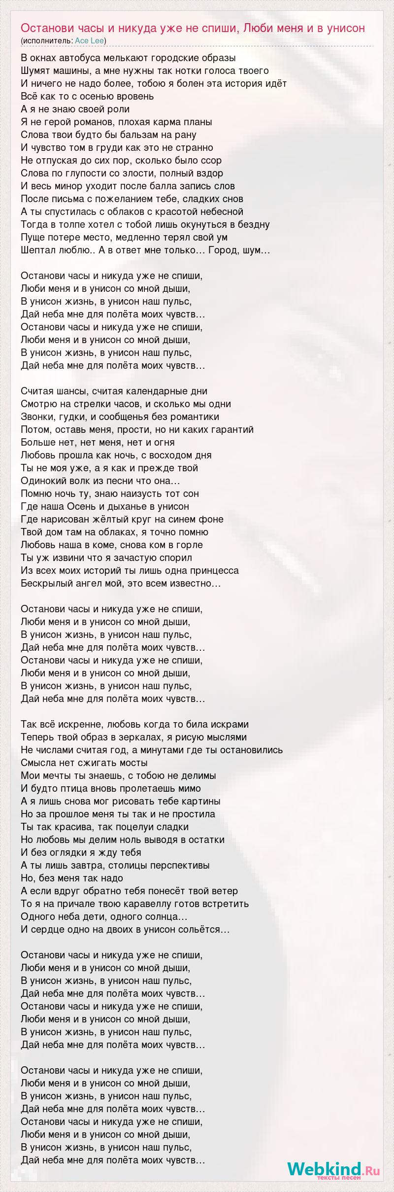 В окнах автобуса мелькают городские образы Шумят машины, а мне нужны так нотки голоса твоего И ничего не надо более, тобою я болен эта история идёт Всё как то с осенью вровень А я не знаю своей роли Я не герой романов, плохая карма планы Слова твои будто бы бальзам на рану И чувство том в груди как это не странно Не отпуская до сих пор, сколько было ссор Слова по глупости со злости, полный вздор И весь минор уходит после балла запись слов После письма с пожеланием тебе, сладких снов А ты спустилась с облаков с красотой небесной Тогда в толпе хотел с тобой лишь окунуться в бездну Пуще потере место, медленно терял свой ум Шептал люблю.. А в ответ мне только… Город, шум… Останови часы и никуда уже не спиши, Люби меня и в унисон со мной дыши, В унисон жизнь, в унисон наш пульс, Дай неба мне для полёта моих чувств… Останови часы и никуда уже не спиши, Люби меня и в унисон со мной дыши, В унисон жизнь, в унисон наш пульс, Дай неба мне для полёта моих чувств… Считая шансы, считая календарные дни Смотрю на стрелки часов, и сколько мы одни Звонки, гудки, и сообщенья без романтики Потом, оставь меня, прости, но ни каких гарантий Больше нет, нет меня, нет и огня Любовь прошла как ночь, с восходом дня Ты не моя уже, а я как и прежде твой Одинокий волк из песни что она… Помню ночь ту, знаю наизусть тот сон Где наша Осень и дыханье в унисон Где нарисован жёлтый круг на синем фоне Твой дом там на облаках, я точно помню Любовь наша в коме, снова ком в горле Ты уж извини что я зачастую спорил Из всех моих историй ты лишь одна принцесса Бескрылый ангел мой, это всем известно… Останови часы и никуда уже не спиши, Люби меня и в унисон со мной дыши, В унисон жизнь, в унисон наш пульс, Дай неба мне для полёта моих чувств… Останови часы и никуда уже не спиши, Люби меня и в унисон со мной дыши, В унисон жизнь, в унисон наш пульс, Дай неба мне для полёта моих чувств… Так всё искренне, любовь когда то била искрами Теперь твой образ в зеркалах, я рисую мыслями Не числами считая год, а минутами где ты остановились Смысла нет сжигать мосты Мои мечты ты знаешь, с тобою не делимы И будто птица вновь пролетаешь мимо А я лишь снова мог рисовать тебе картины Но за прошлое меня ты так и не простила Ты так красива, так поцелуи сладки Но любовь мы делим ноль выводя в остатки И без оглядки я жду тебя А ты лишь завтра, столицы перспективы Но, без меня так надо А если вдруг обратно тебя понесёт твой ветер То я на причале твою каравеллу готов встретить Одного неба дети, одного солнца… И сердце одно на двоих в унисон сольётся… Останови часы и никуда уже не спиши, Люби меня и в унисон со мной дыши, В унисон жизнь, в унисон наш пульс, Дай неба мне для полёта моих чувств… Останови часы и никуда уже не спиши, Люби меня и в унисон со мной дыши, В унисон жизнь, в унисон наш пульс, Дай неба мне для полёта моих чувств… Останови часы и никуда уже не спиши, Люби меня и в унисон со мной дыши, В унисон жизнь, в унисон наш пульс, Дай неба мне для полёта моих чувств… Останови часы и никуда уже не спиши, Люби меня и в унисон со мной дыши, В унисон жизнь, в унисон наш пульс, Дай неба мне для полёта моих чувств…