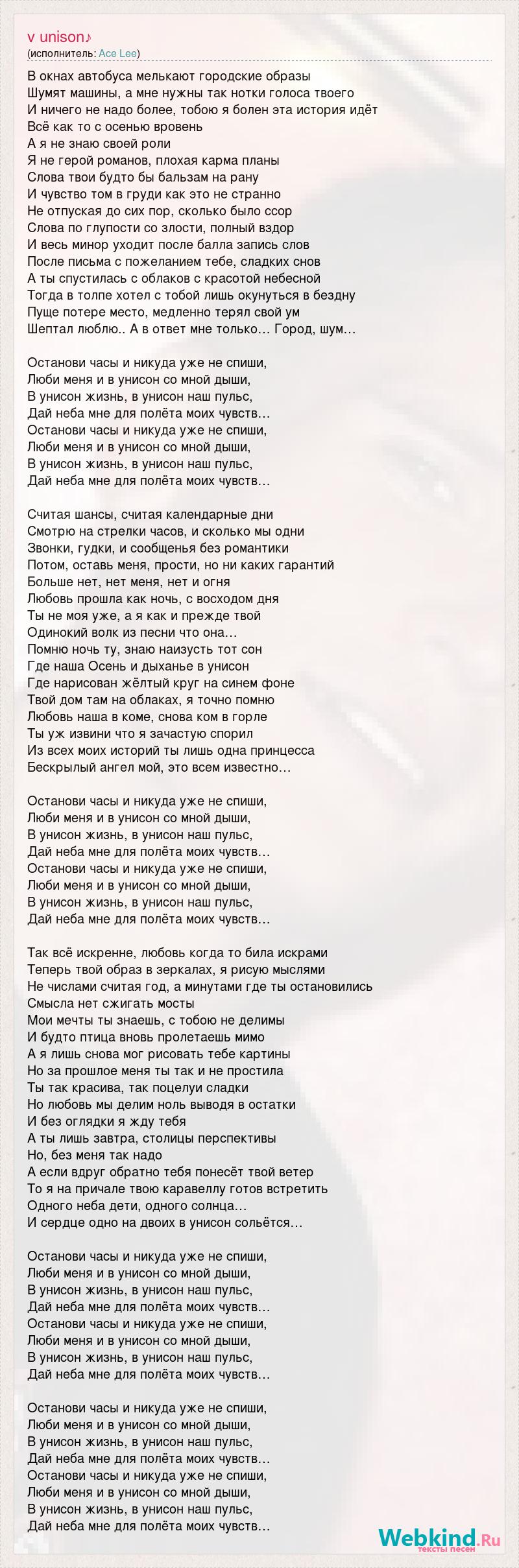В окнах автобуса мелькают городские образы Шумят машины, а мне нужны так нотки голоса твоего И ничего не надо более, тобою я болен эта история идёт Всё как то с осенью вровень А я не знаю своей роли Я не герой романов, плохая карма планы Слова твои будто бы бальзам на рану И чувство том в груди как это не странно Не отпуская до сих пор, сколько было ссор Слова по глупости со злости, полный вздор И весь минор уходит после балла запись слов После письма с пожеланием тебе, сладких снов А ты спустилась с облаков с красотой небесной Тогда в толпе хотел с тобой лишь окунуться в бездну Пуще потере место, медленно терял свой ум Шептал люблю.. А в ответ мне только… Город, шум… Останови часы и никуда уже не спиши, Люби меня и в унисон со мной дыши, В унисон жизнь, в унисон наш пульс, Дай неба мне для полёта моих чувств… Останови часы и никуда уже не спиши, Люби меня и в унисон со мной дыши, В унисон жизнь, в унисон наш пульс, Дай неба мне для полёта моих чувств… Считая шансы, считая календарные дни Смотрю на стрелки часов, и сколько мы одни Звонки, гудки, и сообщенья без романтики Потом, оставь меня, прости, но ни каких гарантий Больше нет, нет меня, нет и огня Любовь прошла как ночь, с восходом дня Ты не моя уже, а я как и прежде твой Одинокий волк из песни что она… Помню ночь ту, знаю наизусть тот сон Где наша Осень и дыханье в унисон Где нарисован жёлтый круг на синем фоне Твой дом там на облаках, я точно помню Любовь наша в коме, снова ком в горле Ты уж извини что я зачастую спорил Из всех моих историй ты лишь одна принцесса Бескрылый ангел мой, это всем известно… Останови часы и никуда уже не спиши, Люби меня и в унисон со мной дыши, В унисон жизнь, в унисон наш пульс, Дай неба мне для полёта моих чувств… Останови часы и никуда уже не спиши, Люби меня и в унисон со мной дыши, В унисон жизнь, в унисон наш пульс, Дай неба мне для полёта моих чувств… Так всё искренне, любовь когда то била искрами Теперь твой образ в зеркалах, я рисую мыслями Не числами считая год, а минутами где ты остановились Смысла нет сжигать мосты Мои мечты ты знаешь, с тобою не делимы И будто птица вновь пролетаешь мимо А я лишь снова мог рисовать тебе картины Но за прошлое меня ты так и не простила Ты так красива, так поцелуи сладки Но любовь мы делим ноль выводя в остатки И без оглядки я жду тебя А ты лишь завтра, столицы перспективы Но, без меня так надо А если вдруг обратно тебя понесёт твой ветер То я на причале твою каравеллу готов встретить Одного неба дети, одного солнца… И сердце одно на двоих в унисон сольётся… Останови часы и никуда уже не спиши, Люби меня и в унисон со мной дыши, В унисон жизнь, в унисон наш пульс, Дай неба мне для полёта моих чувств… Останови часы и никуда уже не спиши, Люби меня и в унисон со мной дыши, В унисон жизнь, в унисон наш пульс, Дай неба мне для полёта моих чувств… Останови часы и никуда уже не спиши, Люби меня и в унисон со мной дыши, В унисон жизнь, в унисон наш пульс, Дай неба мне для полёта моих чувств… Останови часы и никуда уже не спиши, Люби меня и в унисон со мной дыши, В унисон жизнь, в унисон наш пульс, Дай неба мне для полёта моих чувств…
