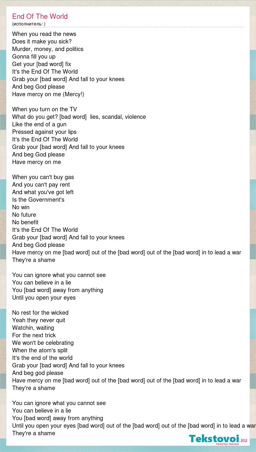When you read the news Does it make you sick? Murder, money, and politics Gonna fill you up Get your [bad word] fix It's the End Of The World Grab your crucifix And fall to your knees And beg God please Have mercy on me (Mercy!) When you turn on the TV What do you get? [bad word] lies, scandal, violence Like the end of a gun Pressed against your lips It's the End Of The World Grab your crucifix And fall to your knees And beg God please Have mercy on me When you can't buy gas And you can't pay rent And what you've got left Is the Government's No win No future No benefit It's the End Of The World Grab your crucifix And fall to your knees And beg God please Have mercy on me Coming out of the hypocrisy Coming out of the bureaucracy Coming in to lead a war They're a shame You can ignore what you cannot see You can believe in a lie You can run away from anything Until you open your eyes No rest for the wicked Yeah they never quit Watchin, waiting For the next trick We won't be celebrating When the atom's split It's the end of the world Grab your crucifix And fall to your knees And beg god please Have mercy on me Coming out of the hypocrisy Coming out of the bureaucracy Coming in to lead a war They're a shame You can ignore what you cannot see You can believe in a lie You can run away from anything Until you open your eyes Coming out of the hypocrisy Coming out of the bureaucracy Coming in to lead a war They're a shame