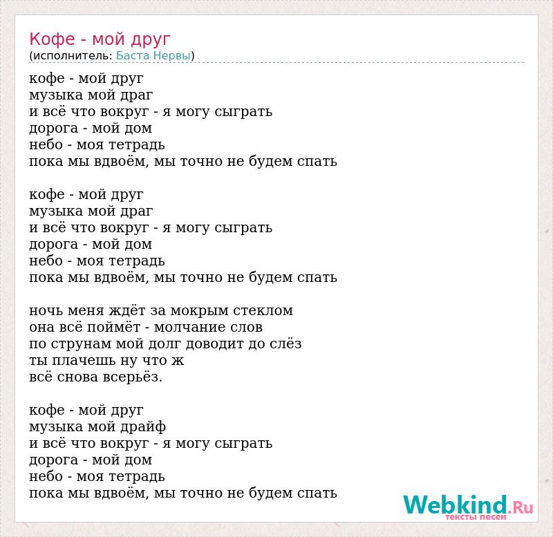 кофе - мой друг музыка мой драг и всё что вокруг - я могу сыграть дорога - мой дом небо - моя тетрадь пока мы вдвоём, мы точно не будем спать кофе - мой друг музыка мой драг и всё что вокруг - я могу сыграть дорога - мой дом небо - моя тетрадь пока мы вдвоём, мы точно не будем спать ночь меня ждёт за мокрым стеклом она всё поймёт - молчание слов по струнам мой долг доводит до слёз ты плачешь ну что ж всё снова всерьёз. кофе - мой друг музыка мой драйф и всё что вокруг - я могу сыграть дорога - мой дом небо - моя тетрадь пока мы вдвоём, мы точно не будем спать