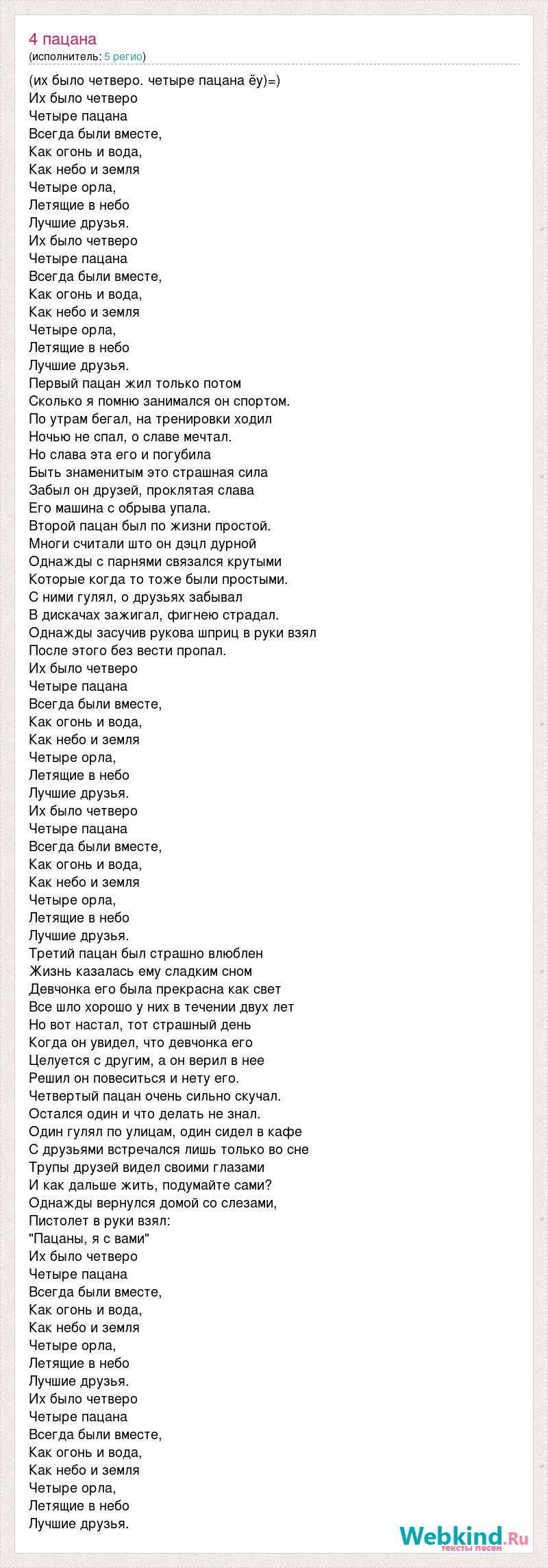 (их было четверо. четыре пацана ёу)=) Их было четверо Четыре пацана Всегда были вместе, Как огонь и вода, Как небо и земля Четыре орла, Летящие в небо Лучшие друзья. Их было четверо Четыре пацана Всегда были вместе, Как огонь и вода, Как небо и земля Четыре орла, Летящие в небо Лучшие друзья. Первый пацан жил только потом Сколько я помню занимался он спортом. По утрам бегал, на тренировки ходил Ночью не спал, о славе мечтал. Но слава эта его и погубила Быть знаменитым это страшная сила Забыл он друзей, проклятая слава Его машина с обрыва упала. Второй пацан был по жизни простой. Многи считали што он дэцл дурной Однажды с парнями связался крутыми Которые когда то тоже были простыми. С ними гулял, о друзьях забывал В дискачах зажигал, фигнею страдал. Однажды засучив рукова шприц в руки взял После этого без вести пропал. Их было четверо Четыре пацана Всегда были вместе, Как огонь и вода, Как небо и земля Четыре орла, Летящие в небо Лучшие друзья. Их было четверо Четыре пацана Всегда были вместе, Как огонь и вода, Как небо и земля Четыре орла, Летящие в небо Лучшие друзья. Третий пацан был страшно влюблен Жизнь казалась ему сладким сном Девчонка его была прекрасна как свет Все шло хорошо у них в течении двух лет Но вот настал, тот страшный день Когда он увидел, что девчонка его Целуется с другим, а он верил в нее Решил он повеситься и нету его. Четвертый пацан очень сильно скучал. Остался один и что делать не знал. Один гулял по улицам, один сидел в кафе С друзьями встречался лишь только во сне Трупы друзей видел своими глазами И как дальше жить, подумайте сами? Однажды вернулся домой со слезами, Пистолет в руки взял: "Пацаны, я с вами" Их было четверо Четыре пацана Всегда были вместе, Как огонь и вода, Как небо и земля Четыре орла, Летящие в небо Лучшие друзья. Их было четверо Четыре пацана Всегда были вместе, Как огонь и вода, Как небо и земля Четыре орла, Летящие в небо Лучшие друзья.