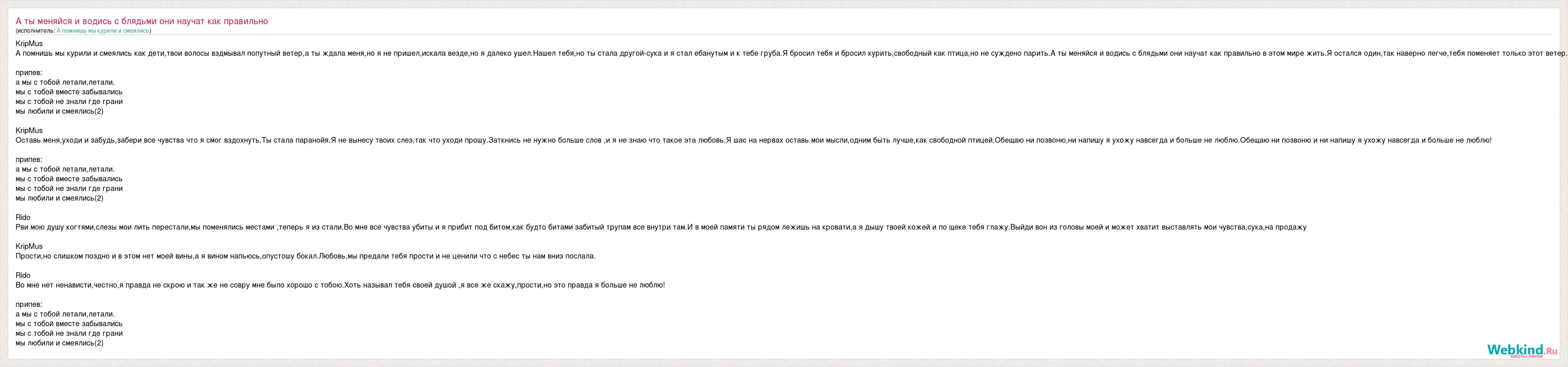 Главная→Исполнители→А помнишь мы курили и смеялись как дети,твои волосы вздмывал попутный ветер,а ты ждала меня,но я не пришел,искала везде,но я далеко ушел.Нашел тебя,но ты стала другой-сука и я стал ебанутым и к тебе груба.Я бросил тебя и бросил курить,свободный как птица,→А ты меняйся и водись с блядьми они научат как правильно в этом мире жить.Я