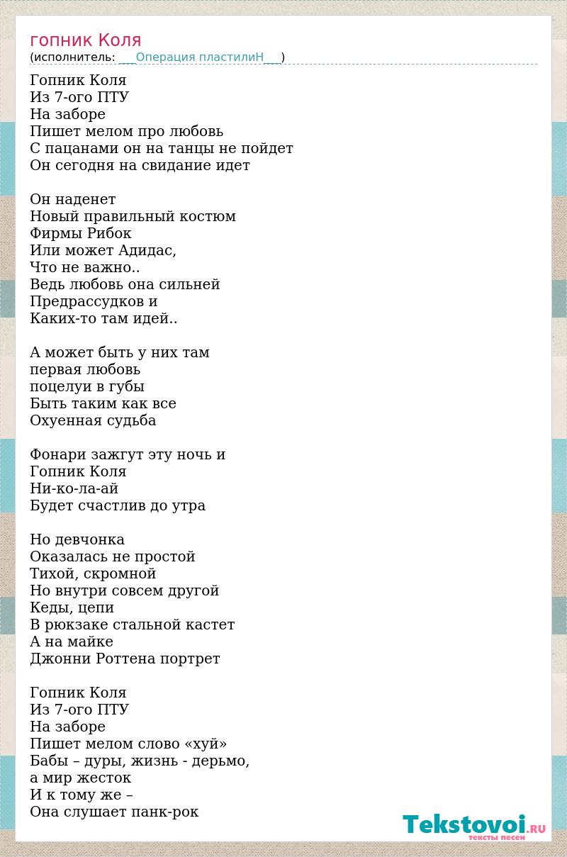 Гопник Коля Из 7-ого ПТУ На заборе Пишет мелом про любовь С пацанами он на танцы не пойдет Он сегодня на свидание идет Он наденет Новый правильный костюм Фирмы Рибок Или может Адидас, Что не важно.. Ведь любовь она сильней Предрассудков и Каких-то там идей.. А может быть у них там первая любовь поцелуи в губы Быть таким как все Охуенная судьба Фонари зажгут эту ночь и Гопник Коля Ни-ко-ла-ай Будет счастлив до утра Но девчонка Оказалась не простой Тихой, скромной Но внутри совсем другой Кеды, цепи В рюкзаке стальной кастет А на майке Джонни Роттена портрет Гопник Коля Из 7-ого ПТУ На заборе Пишет мелом слово «хуй» Бабы – дуры, жизнь - дерьмо, а мир жесток И к тому же – Она слушает панк-рок