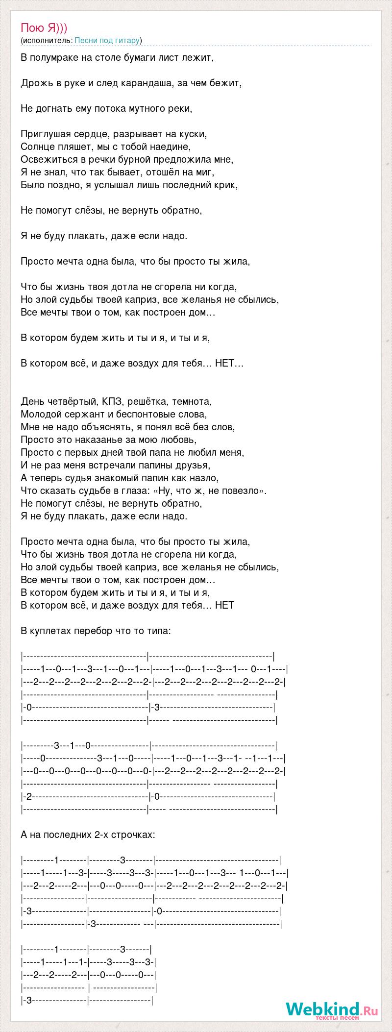 В полумраке на столе бумаги лист лежит, Дрожь в руке и след карандаша, за чем бежит, Не догнать ему потока мутного реки, Приглушая сердце, разрывает на куски, Солнце пляшет, мы с тобой наедине, Освежиться в речки бурной предложила мне, Я не знал, что так бывает, отошёл на миг, Было поздно, я услышал лишь последний крик, Не помогут слёзы, не вернуть обратно, Я не буду плакать, даже если надо. Просто мечта одна была, что бы просто ты жила, Что бы жизнь твоя дотла не сгорела ни когда, Но злой судьбы твоей каприз, все желанья не сбылись, Все мечты твои о том, как построен дом… В котором будем жить и ты и я, и ты и я, В котором всё, и даже воздух для тебя… НЕТ… День четвёртый, КПЗ, решётка, темнота, Молодой сержант и беспонтовые слова, Мне не надо объяснять, я понял всё без слов, Просто это наказанье за мою любовь, Просто с первых дней твой папа не любил меня, И не раз меня встречали папины друзья, А теперь судья знакомый папин как назло, Что сказать судьбе в глаза: «Ну, что ж, не повезло». Не помогут слёзы, не вернуть обратно, Я не буду плакать, даже если надо. Просто мечта одна была, что бы просто ты жила, Что бы жизнь твоя дотла не сгорела ни когда, Но злой судьбы твоей каприз, все желанья не сбылись, Все мечты твои о том, как построен дом… В котором будем жить и ты и я, и ты и я, В котором всё, и даже воздух для тебя… НЕТ В куплетах перебор что то типа: |------------------------------------|------------------------------------| |-----1---0---1---3---1---0---1---|-----1---0---1---3---1--- 0---1----| |---2---2---2---2---2---2---2---2-|---2---2---2---2---2---2---2---2-| |------------------------------------|------------------- -----------------| |-0----------------------------------|-3---------------------------------| |------------------------------------|------ ------------------------------| |---------3---1---0-----------------|------------------------------------| |-----0---------------3---1---0-----|-----1---0---1---3---1- --1---1---| |---0---0---0---0---0---0---0---0-|---2---2---2---2---2---2---2---2-| |------------------------------------|------------------ ------------------| |-2----------------------------------|-0---------------------------------| |------------------------------------|----- -------------------------------| А на последних 2-х строчках: |---------1--------|---------3--------|------------------------------------| |-----1-----1---3-|-----3-----3---3-|-----1---0---1---3--- 1---0---1---| |---2---2-----2---|---0---0-----0---|---2---2---2---2---2---2---2---2-| |------------------|-------------------|------------ ------------------------| |-3----------------|------------------|-0----------------------------------| |------------------|-3------------- ---|------------------------------------| |---------1--------|---------3-------| |-----1-----1---1-|-----3-----3---3-| |---2---2-----2---|---0---0-----0---| |------------------ | ------------------| |-3----------------|------------------|