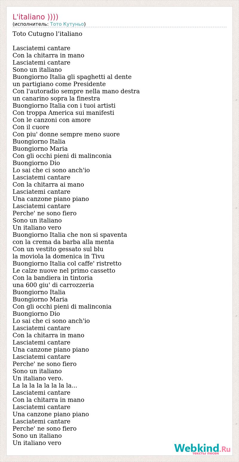 Toto Cutugno l’italiano Lasciatemi cantare Con la chitarra in mano Lasciatemi cantare Sono un italiano Buongiorno Italia gli spaghetti al dente un partigiano come Presidente Con l'autoradio sempre nella mano destra un canarino sopra la finestra Buongiorno Italia con i tuoi artisti Con troppa America sui manifesti Con le canzoni con amore Con il cuore Con piu' donne sempre meno suore Buongiorno Italia Buongiorno Maria Con gli occhi pieni di malinconia Buongiorno Dio Lo sai che ci sono anch'io Lasciatemi cantare Con la chitarra ai mano Lasciatemi cantare Una canzone piano piano Lasciatemi cantare Perche' ne sono fiero Sono un italiano Un italiano vero Buongiorno Italia che non si spaventa con la crema da barba alla menta Con un vestito gessato sul blu la moviola la domenica in Tivu Buongiorno Italia col caffe' ristretto Le calze nuove nel primo cassetto Con la bandiera in tintoria una 600 giu' di carrozzeria Buongiorno Italia Buongiorno Maria Con gli occhi pieni di malinconia Buongiorno Dio Lo sai che ci sono anch'io Lasciatemi cantare Con la chitarra in mano Lasciatemi cantare Una canzone piano piano Lasciatemi cantare Perche' ne sono fiero Sono un italiano Un italiano vero. La la la la la la la la... Lasciatemi cantare Con la chitarra in mano Lasciatemi cantare Una canzone piano piano Lasciatemi cantare Perche' ne sono fiero Sono un italiano Un italiano vero
