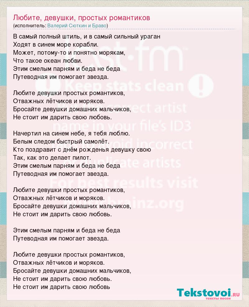 В самый полный штиль, и в самый сильный ураган Ходят в синем море корабли. Может, потому-то и понятно морякам, Что такое океан любви. Этим смелым парням и беда не беда Путеводная им помогает звезда. Любите девушки простых романтиков, Отважных лётчиков и моряков. Бросайте девушки домашних мальчиков, Не стоит им дарить свою любовь. Начертил на синем небе, я тебя люблю. Белым следом быстрый самолёт. Кто поздравит с днём рожденья девушку свою Так, как это делает пилот. Этим смелым парням и беда не беда Путеводная им помогает звезда. Любите девушки простых романтиков, Отважных лётчиков и моряков. Бросайте девушки домашних мальчиков, Не стоит им дарить свою любовь. Этим смелым парням и беда не беда Путеводная им помогает звезда. Любите девушки простых романтиков, Отважных лётчиков и моряков. Бросайте девушки домашних мальчиков, Не стоит им дарить свою любовь. Не стоит им дарить свою любовь