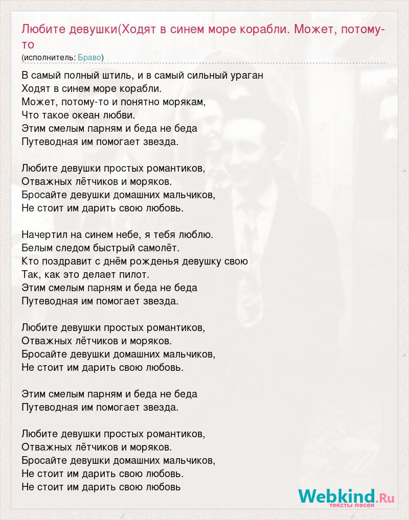 В самый полный штиль, и в самый сильный ураган Ходят в синем море корабли. Может, потому-то и понятно морякам, Что такое океан любви. Этим смелым парням и беда не беда Путеводная им помогает звезда. Любите девушки простых романтиков, Отважных лётчиков и моряков. Бросайте девушки домашних мальчиков, Не стоит им дарить свою любовь. Начертил на синем небе, я тебя люблю. Белым следом быстрый самолёт. Кто поздравит с днём рожденья девушку свою Так, как это делает пилот. Этим смелым парням и беда не беда Путеводная им помогает звезда. Любите девушки простых романтиков, Отважных лётчиков и моряков. Бросайте девушки домашних мальчиков, Не стоит им дарить свою любовь. Этим смелым парням и беда не беда Путеводная им помогает звезда. Любите девушки простых романтиков, Отважных лётчиков и моряков. Бросайте девушки домашних мальчиков, Не стоит им дарить свою любовь. Не стоит им дарить свою любовь