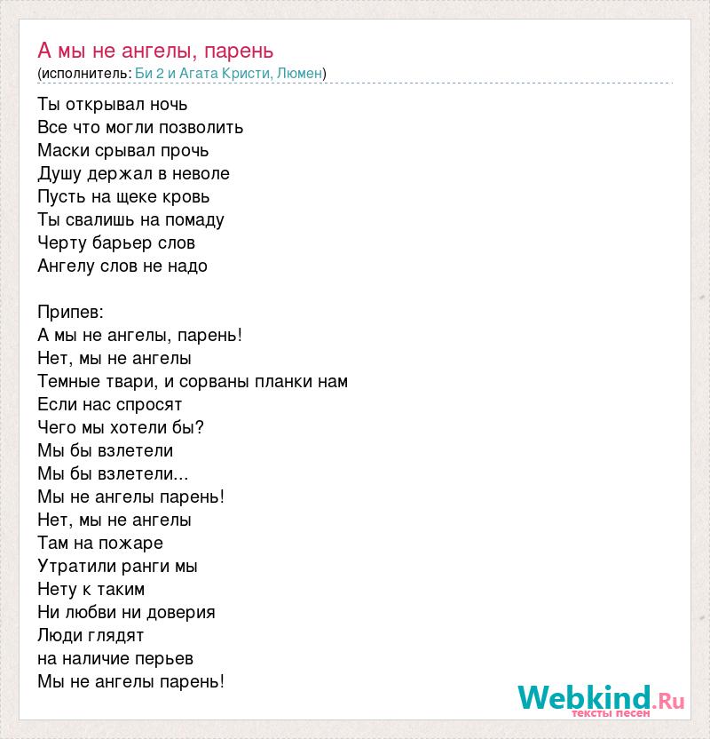 Ты открывал ночь Все что могли позволить Маски срывал прочь Душу держал в неволе Пусть на щеке кровь Ты свалишь на помаду Черту барьер слов Ангелу слов не надо Припев: А мы не ангелы, парень! Нет, мы не ангелы Темные твари, и сорваны планки нам Если нас спросят Чего мы хотели бы? Мы бы взлетели Мы бы взлетели... Мы не ангелы парень! Нет, мы не ангелы Там на пожаре Утратили ранги мы Нету к таким Ни любви ни доверия Люди глядят на наличие перьев Мы не ангелы парень!