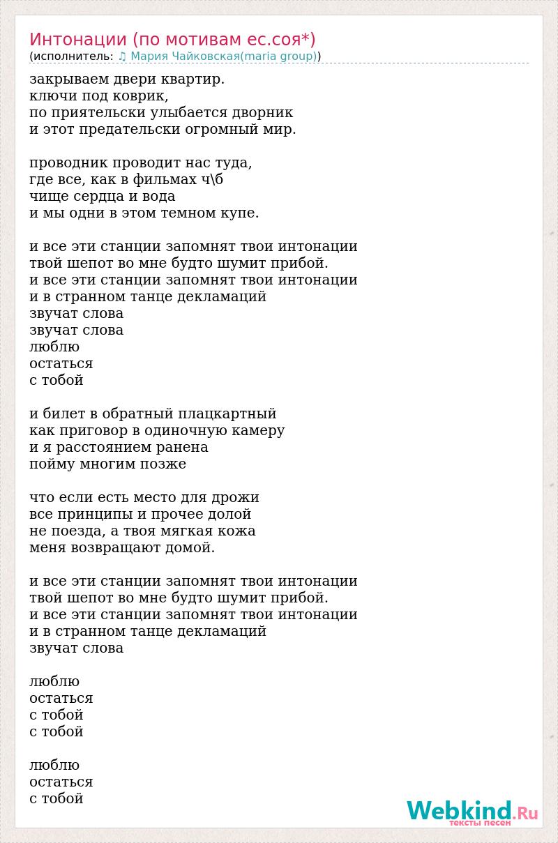 закрываем двери квартир. ключи под коврик, по приятельски улыбается дворник и этот предательски огромный мир. проводник проводит нас туда, где все, как в фильмах ч\б чище сердца и вода и мы одни в этом темном купе. и все эти станции запомнят твои интонации твой шепот во мне будто шумит прибой. и все эти станции запомнят твои интонации и в странном танце декламаций звучат слова звучат слова люблю остаться с тобой и билет в обратный плацкартный как приговор в одиночную камеру и я расстоянием ранена пойму многим позже что если есть место для дрожи все принципы и прочее долой не поезда, а твоя мягкая кожа меня возвращают домой. и все эти станции запомнят твои интонации твой шепот во мне будто шумит прибой. и все эти станции запомнят твои интонации и в странном танце декламаций звучат слова люблю остаться с тобой с тобой люблю остаться с тобой