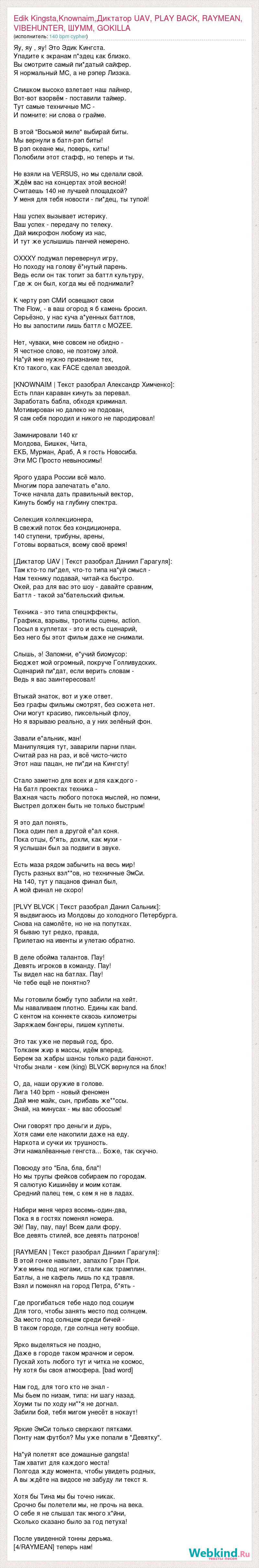 Яу, яу , яу! Это Эдик Кингста. Упадите к экранам п*здец как близко. Вы смотрите самый пи*датый сайфер. Я нормальный МС, а не рэпер Лиззка. Слишком высоко взлетает наш лайнер, Вот-вот взорвём - поставили таймер. Тут самые техничные MC - И помните: ни слова о грайме. В этой "Восьмой миле" выбирай биты. Мы вернули в батл-рэп биты! В рэп океане мы, поверь, киты! Полюбили этот стафф, но теперь и ты. Не взяли на VERSUS, но мы сделали свой. Ждём вас на концертах этой весной! Считаешь 140 не лучшей площадкой? У меня для тебя новости - пи*дец, ты тупой! Наш успех вызывает истерику. Ваш успех - передачу по телеку. Дай микрофон любому из нас, И тут же услышишь панчей немерено. OXXXY подумал перевернул игру, Но походу на голову ё*нутый парень. Ведь если он так топит за баттл культуру, Где ж он был, когда мы её поднимали? К черту рэп СМИ освещают свои The Flow, - в ваш огород я б камень бросил. Серьёзно, у нас куча а*уенных баттлов, Но вы запостили лишь баттл с MOZEE. Нет, чуваки, мне совсем не обидно - Я честное слово, не поэтому злой. На*уй мне нужно признание тех, Кто такого, как FACE сделал звездой. [KNOWNAIM | Текст разобрал Александр Химченко]: Есть план караван кинуть за перевал. Заработать бабла, обходя криминал. Мотивирован но далеко не подован, Я сам себя породил и никого не пародировал! Заминировали 140 кг Молдова, Бишкек, Чита, ЕКБ, Мурман, Араб, А я гость Новосиба. Эти МС Просто невыносимы! Ярого удара России всё мало. Многим пора запечатать е*ало. Точке начала дать правильный вектор, Кинуть бомбу на глубину спектра. Селекция коллекционера, В свежий поток без кондиционера. 140 ступени, трибуны, арены, Готовы ворваться, всему своё время! [Диктатор UAV | Текст разобрал Даниил Гарагуля]: Там кто-то пи*дел, что-то типа на*уй смысл - Нам технику подавай, читай-ка быстро. Окей, раз для вас это шоу - давайте сравним, Баттл - такой за*бательский фильм. Техника - это типа спецэффекты, Графика, взрывы, тротилы сцены, action. Посыл в куплетах - это и есть сценарий, Без него бы этот фильм даже не снимали. Слышь, э! Запомни, е*учий биомусор: Бюджет мой огромный, покруче Голливудских. Сценарий пи*дат, если верить словам - Ведь я вас заинтересовал! Втыкай знаток, вот и уже ответ. Без графы фильмы смотрят, без сюжета нет. Они могут красиво, пиксельный флоу, Но я взрываю реально, а у них зелёный фон. Завали е*альник, ман! Манипуляция тут, заварили парни план. Считай раз на раз, и всё чисто-чисто Этот наш пацан, не пи*ди на Кингсту! Стало заметно для всех и для каждого - На батл проектах техника - Важная часть любого потока мыслей, но помни, Выстрел должен быть не только быстрым! Я это дал понять, Пока один пел а другой е*ал коня. Пока отцы, б*ять, дохли, как мухи - Я услышан был за подвиги в звуке. Есть маза рядом забычить на весь мир! Пусть разных взл**ов, но техничные ЭмСи. На 140, тут у пацанов финал был, А мой финал не скоро! [PLVY BLVCK | Текст разобрал Данил Сальник]: Я выдвигаюсь из Молдовы до холодного Петербурга. Снова на самолёте, но не на попутках. Я бываю тут редко, правда, Прилетаю на ивенты и улетаю обратно. В деле обойма талантов. Пау! Девять игроков в команду. Пау! Ты видел нас на батлах. Пау! Че тебе ещё не понятно? Мы готовили бомбу тупо забили на хейт. Мы наваливаем плотно. Едины как band. С кентом на коннекте сквозь километры Заряжаем бэнгеры, пишем куплеты. Это так уже не первый год, бро. Толкаем жир в массы, идём вперед. Берем за жабры шансы только ради ба