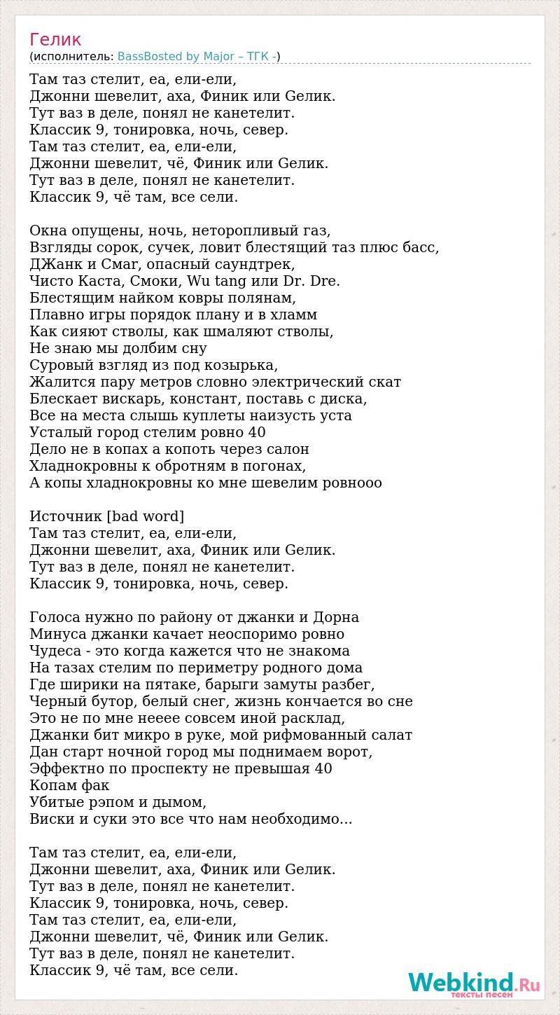 Там таз стелит, еа, ели-ели, Джонни шевелит, аха, Финик или Gелик. Тут ваз в деле, понял не канетелит. Классик 9, тонировка, ночь, север. Там таз стелит, еа, ели-ели, Джонни шевелит, чё, Финик или Gелик. Тут ваз в деле, понял не канетелит. Классик 9, чё там, все сели. Окна опущены, ночь, неторопливый газ, Взгляды сорок, сучек, ловит блестящий таз плюс басс, ДЖанк и Смаr, опасный саундтрек, Чисто Каста, Смоки, Wu tang или Dr. Dre. Блестящим найком ковры полянам, Плавно игры порядок плану и в хламм Как сияют стволы, как шмаляют стволы, Не знаю мы долбим сну Суровый взгляд из под козырька, Жалится пару метров словно электрический скат Блескает вискарь, констант, поставь с диска, Все на места слышь куплеты наизусть уста Усталый город стелим ровно 40 Дело не в копах а копоть через салон Хладнокровны к обротням в погонах, А копы хладнокровны ко мне шевелим ровнооо Источник [bad word] Там таз стелит, еа, ели-ели, Джонни шевелит, аха, Финик или Gелик. Тут ваз в деле, понял не канетелит. Классик 9, тонировка, ночь, север. Голоса нужно по району от джанки и Дорна Минуса джанки качает неоспоримо ровно Чудеса - это когда кажется что не знакома На тазах стелим по периметру родного дома Где ширики на пятаке, барыги замуты разбег, Черный бутор, белый снег, жизнь кончается во сне Это не по мне нееее совсем иной расклад, Джанки бит микро в руке, мой рифмованный салат Дан старт ночной город мы поднимаем ворот, Эффектно по проспекту не превышая 40 Копам фак Убитые рэпом и дымом, Виски и суки это все что нам необходимо... Там таз стелит, еа, ели-ели, Джонни шевелит, аха, Финик или Gелик. Тут ваз в деле, понял не канетелит. Классик 9, тонировка, ночь, север. Там таз стелит, еа, ели-ели, Джонни шевелит, чё, Финик или Gелик. Тут ваз в деле, понял не канетелит. Классик 9, чё там, все сели.