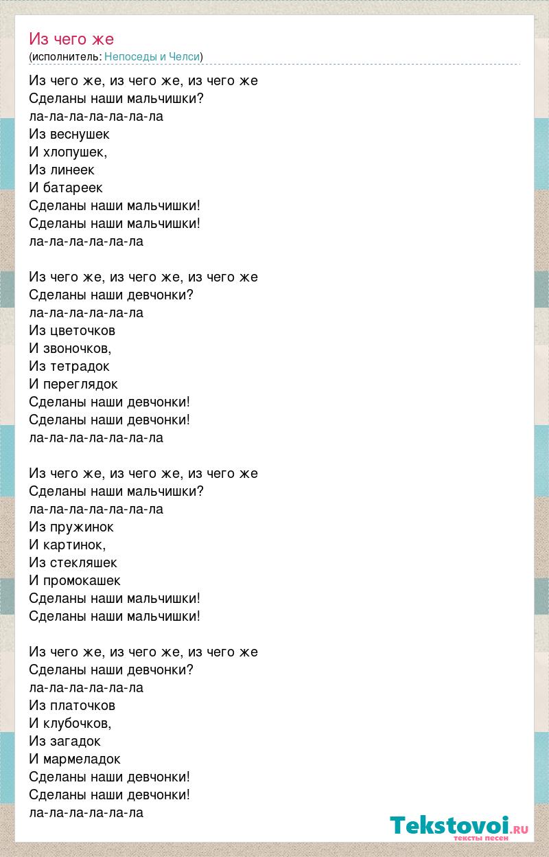 Из чего же, из чего же, из чего же Сделаны наши мальчишки? ла-ла-ла-ла-ла-ла-ла Из веснушек И хлопушек, Из линеек И батареек Сделаны наши мальчишки! Сделаны наши мальчишки! ла-ла-ла-ла-ла-ла Из чего же, из чего же, из чего же Сделаны наши девчонки? ла-ла-ла-ла-ла-ла Из цветочков И звоночков, Из тетрадок И переглядок Сделаны наши девчонки! Сделаны наши девчонки! ла-ла-ла-ла-ла-ла-ла Из чего же, из чего же, из чего же Сделаны наши мальчишки? ла-ла-ла-ла-ла-ла-ла Из пружинок И картинок, Из стекляшек И промокашек Сделаны наши мальчишки! Сделаны наши мальчишки! Из чего же, из чего же, из чего же Сделаны наши девчонки? ла-ла-ла-ла-ла-ла Из платочков И клубочков, Из загадок И мармеладок Сделаны наши девчонки! Сделаны наши девчонки! ла-ла-ла-ла-ла-ла