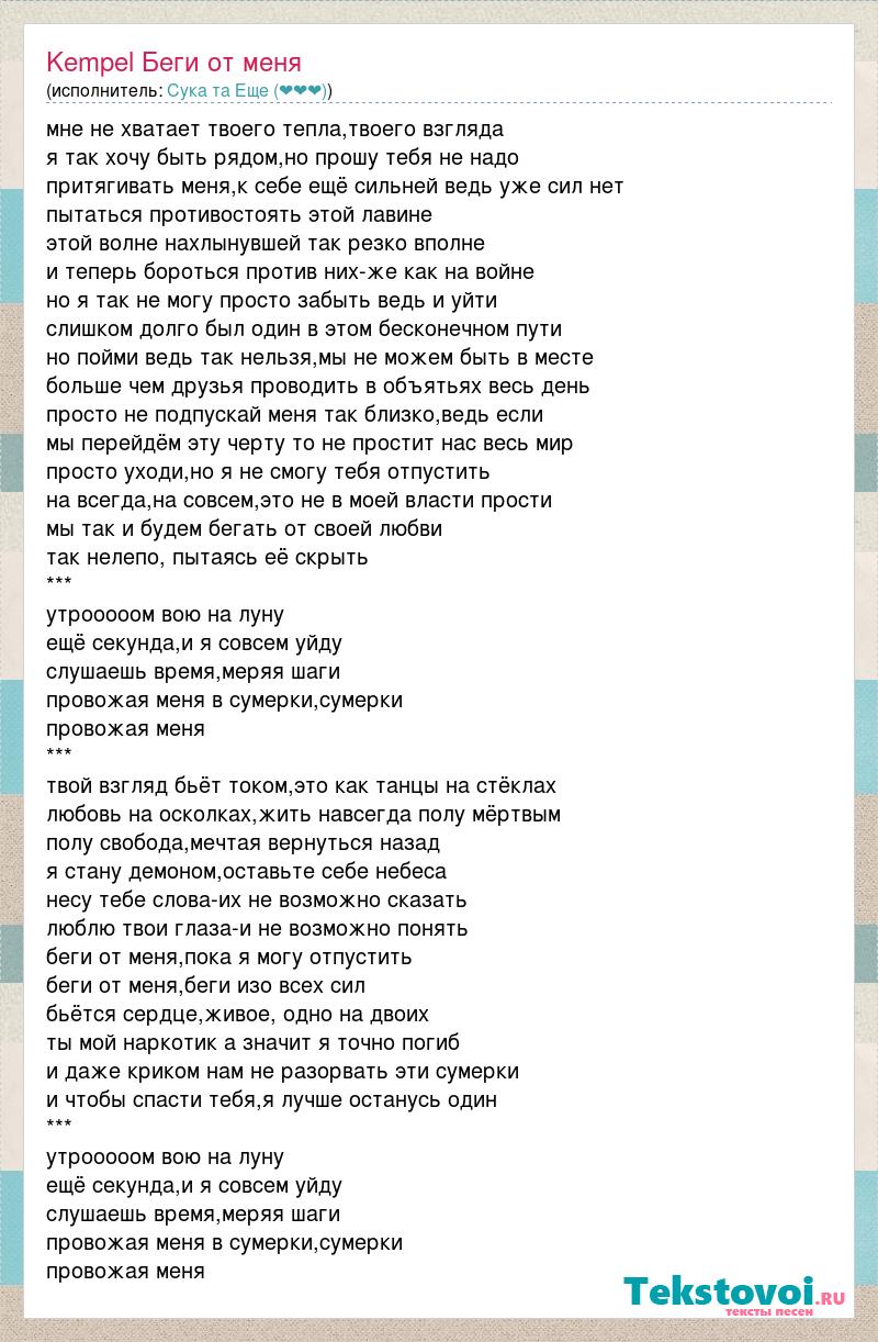 мне не хватает твоего тепла,твоего взгляда я так хочу быть рядом,но прошу тебя не надо притягивать меня,к себе ещё сильней ведь уже сил нет пытаться противостоять этой лавине этой волне нахлынувшей так резко вполне и теперь бороться против них-же как на войне но я так не могу просто забыть ведь и уйти слишком долго был один в этом бесконечном пути но пойми ведь так нельзя,мы не можем быть в месте больше чем друзья проводить в объятьях весь день просто не подпускай меня так близко,ведь если мы перейдём эту черту то не простит нас весь мир просто уходи,но я не смогу тебя отпустить на всегда,на совсем,это не в моей власти прости мы так и будем бегать от своей любви так нелепо, пытаясь её скрыть *** утрооооом вою на луну ещё секунда,и я совсем уйду слушаешь время,меряя шаги провожая меня в сумерки,сумерки провожая меня *** твой взгляд бьёт током,это как танцы на стёклах любовь на осколках,жить навсегда полу мёртвым полу свобода,мечтая вернуться назад я стану демоном,оставьте себе небеса несу тебе слова-их не возможно сказать люблю твои глаза-и не возможно понять беги от меня,пока я могу отпустить беги от меня,беги изо всех сил бьётся сердце,живое, одно на двоих ты мой наркотик а значит я точно погиб и даже криком нам не разорвать эти сумерки и чтобы спасти тебя,я лучше останусь один *** утрооооом вою на луну ещё секунда,и я совсем уйду слушаешь время,меряя шаги провожая меня в сумерки,сумерки провожая меня