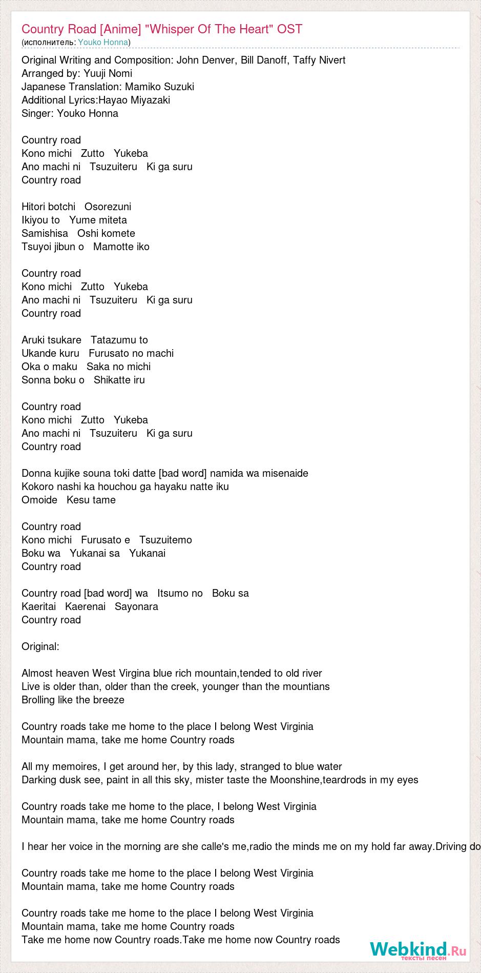 Original Writing and Composition: John Denver, Bill Danoff, Taffy Nivert Arranged by: Yuuji Nomi Japanese Translation: Mamiko Suzuki Additional Lyrics:Hayao Miyazaki Singer: Youko Honna Country road Kono michi Zutto Yukeba Ano machi ni Tsuzuiteru Ki ga suru Country road Hitori botchi Osorezuni Ikiyou to Yume miteta Samishisa Oshi komete Tsuyoi jibun o Mamotte iko Country road Kono michi Zutto Yukeba Ano machi ni Tsuzuiteru Ki ga suru Country road Aruki tsukare Tatazumu to Ukande kuru Furusato no machi Oka o maku Saka no michi Sonna boku o Shikatte iru Country road Kono michi Zutto Yukeba Ano machi ni Tsuzuiteru Ki ga suru Country road Donna kujike souna toki datte [bad word] namida wa misenaide Kokoro nashi ka houchou ga hayaku natte iku Omoide Kesu tame Country road Kono michi Furusato e Tsuzuitemo Boku wa Yukanai sa Yukanai Country road Country road [bad word] wa Itsumo no Boku sa Kaeritai Kaerenai Sayonara Country road Original: Almost heaven West Virgina blue rich mountain,tended to old river Live is older than, older than the creek, younger than the mountians Brolling like the breeze Country roads take me home to the place I belong West Virginia Mountain mama, take me home Country roads All my memoires, I get around her, by this lady, stranged to blue water Darking dusk see, paint in all this sky, mister taste the Moonshine,teardrods in my eyes Country roads take me home to the place, I belong West Virginia Mountain mama, take me home Country roads I hear her voice in the morning are she calle's me,radio the minds me on my hold far away.Driving do Country roads take me home to the place I belong West Virginia Mountain mama, take me home Country roads Country roads take me home to the place I belong West Virginia Mountain mama, take me home Country roads Take me home now Country roads.Take me home now Country roads