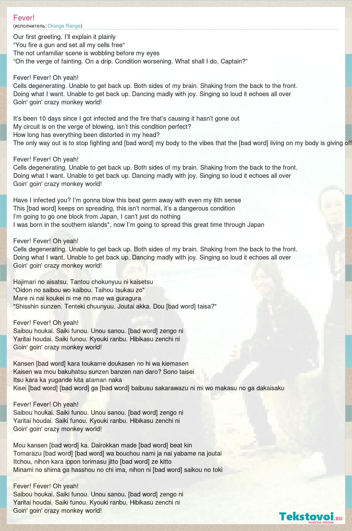 Our first greeting. I’ll explain it plainly “You fire a gun and set all my cells free” The not unfamiliar scene is wobbling before my eyes “On the verge of fainting. On a drip. Condition worsening. What shall I do, Captain?” Fever! Fever! Oh yeah! Cells degenerating. Unable to get back up. Both sides of my brain. Shaking from the back to the front. Doing what I want. Unable to get back up. Dancing madly with joy. Singing so loud it echoes all over Goin' goin' crazy monkey world! It’s been 10 days since I got infected and the fire that’s causing it hasn’t gone out My circuit is on the verge of blowing, isn’t this condition perfect? How long has everything been distorted in my head? The only way out is to stop fighting and [bad word] my body to the vibes that the [bad word] living on my body is giving off Fever! Fever! Oh yeah! Cells degenerating. Unable to get back up. Both sides of my brain. Shaking from the back to the front. Doing what I want. Unable to get back up. Dancing madly with joy. Singing so loud it echoes all over Goin' goin' crazy monkey world! Have I infected you? I’m gonna blow this beat germ away with even my 6th sense This [bad word] keeps on spreading, this isn’t normal, it’s a dangerous condition I’m going to go one block from Japan, I can’t just do nothing I was born in the southern islands*, now I’m going to spread this great time through Japan Fever! Fever! Oh yeah! Cells degenerating. Unable to get back up. Both sides of my brain. Shaking from the back to the front. Doing what I want. Unable to get back up. Dancing madly with joy. Singing so loud it echoes all over Goin' goin' crazy monkey world! Hajimari no aisatsu. Tantou chokunyuu ni kaisetsu "Oidon no saibou wo kaibou. Taihou tsukau zo" Mare ni nai koukei ni me no mae wa guragura "Shisshin sunzen. Tenteki chuunyuu. Joutai akka. Dou [bad word] taisa?" Fever! Fever! Oh yeah! Saibou houkai. Saiki funou. Unou sanou. [bad word] zengo ni Yaritai houdai. Saiki funou. Kyouki ranbu. Hibikasu zenchi ni Goin' goin' crazy monkey world! Kansen [bad word] kara toukame doukasen no hi wa kiemasen Kaisen wa mou bakuhatsu sunzen banzen nan daro? Sono taisei Itsu kara ka yugande kita ataman naka Kisei [bad word] uirusu ga [bad word] baibusu sakarawazu ni mi wo makasu no ga dakaisaku Fever! Fever! Oh yeah! Saibou houkai. Saiki funou. Unou sanou. [bad word] zengo ni Yaritai houdai. Saiki funou. Kyouki ranbu. Hibikasu zenchi ni Goin' goin' crazy monkey world! Mou kansen [bad word] ka. Dairokkan made [bad word] beat kin Tomarazu [bad word] uirusu wa bouchou nami ja nai yabame na joutai Itchou, nihon kara ippon torimasu jitto [bad word] ze kitto Minami no shima ga hasshou no chi ima, nihon ni [bad word] saikou no toki Fever! Fever! Oh yeah! Saibou houkai. Saiki funou. Unou sanou. [bad word] zengo ni Yaritai houdai. Saiki funou. Kyouki ranbu. Hibikasu zenchi ni Goin' goin' crazy monkey world!