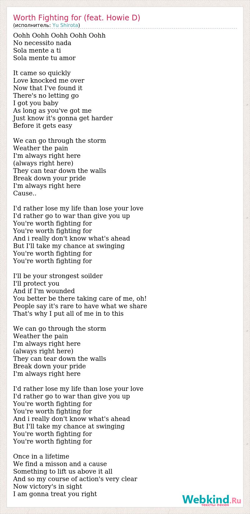 Oohh Oohh Oohh Oohh Oohh No necessito nada Sola mente a ti Sola mente tu amor It came so quickly Love knocked me over Now that I've found it There's no letting go I got you baby As long as you've got me Just know it's gonna get harder Before it gets easy We can go through the storm Weather the pain I'm always right here (always right here) They can tear down the walls Break down your pride I'm always right here Cause.. I'd rather lose my life than lose your love I'd rather go to war than give you up You're worth fighting for You're worth fighting for And i really don't know what's ahead But I'll take my chance at swinging You're worth fighting for You're worth fighting for I'll be your strongest soilder I'll protect you And if I'm wounded You better be there taking care of me, oh! People say it's rare to have what we share That's why I put all of me in to this We can go through the storm Weather the pain I'm always right here (always right here) They can tear down the walls Break down your pride I'm always right here I'd rather lose my life than lose your love I'd rather go to war than give you up You're worth fighting for You're worth fighting for And i really don't know what's ahead But I'll take my chance at swinging You're worth fighting for You're worth fighting for Once in a lifetime We find a misson and a cause Something to lift us above it all And so my course of action's very clear Now victory's in sight I am gonna treat you right