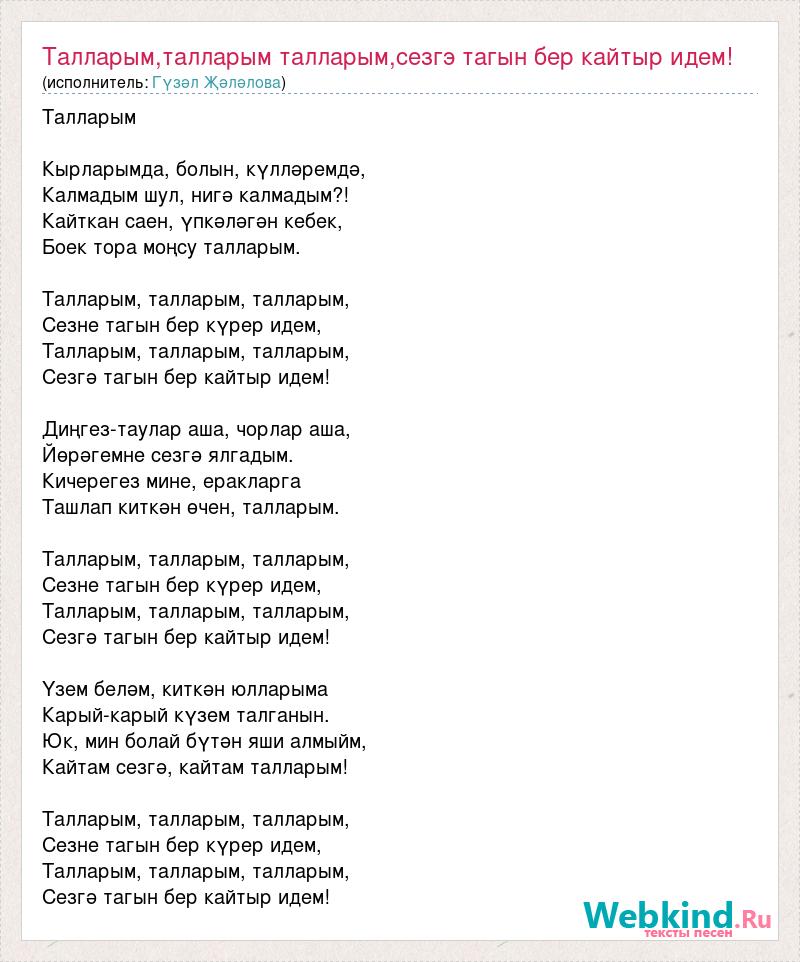 Талларым Кырларымда, болын, күлләремдә, Калмадым шул, нигә калмадым?! Кайткан саен, үпкәләгән кебек, Боек тора моңсу талларым. Талларым, талларым, талларым, Сезне тагын бер күрер идем, Талларым, талларым, талларым, Сезгә тагын бер кайтыр идем! Диңгез-таулар аша, чорлар аша, Йөрәгемне сезгә ялгадым. Кичерегез мине, еракларга Ташлап киткән өчен, талларым. Талларым, талларым, талларым, Сезне тагын бер күрер идем, Талларым, талларым, талларым, Сезгә тагын бер кайтыр идем! Үзем беләм, киткән юлларыма Карый-карый күзем талганын. Юк, мин болай бүтән яши алмыйм, Кайтам сезгә, кайтам талларым! Талларым, талларым, талларым, Сезне тагын бер күрер идем, Талларым, талларым, талларым, Сезгә тагын бер кайтыр идем!