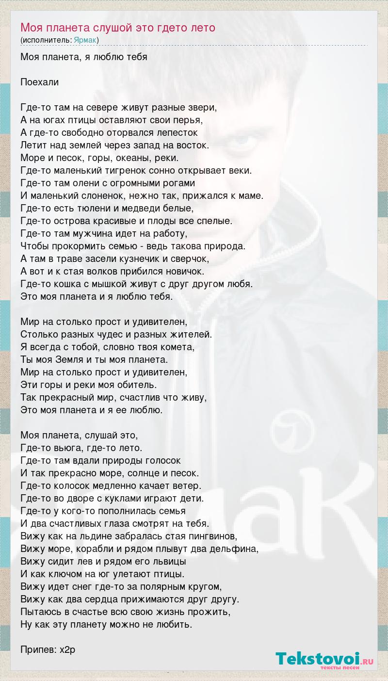 Моя планета, я люблю тебя Поехали Где-то там на севере живут разные звери, А на югах птицы оставляют свои перья, А где-то свободно оторвался лепесток Летит над землей через запад на восток. Море и песок, горы, океаны, реки. Где-то маленький тигренок сонно открывает веки. Где-то там олени с огромными рогами И маленький слоненок, нежно так, прижался к маме. Где-то есть тюлени и медведи белые, Где-то острова красивые и плоды все спелые. Где-то там мужчина идет на работу, Чтобы прокормить семью - ведь такова природа. А там в траве засели кузнечик и сверчок, А вот и к стая волков прибился новичок. Где-то кошка с мышкой живут с друг другом любя. Это моя планета и я люблю тебя. Мир на столько прост и удивителен, Столько разных чудес и разных жителей. Я всегда с тобой, словно твоя комета, Ты моя Земля и ты моя планета. Мир на столько прост и удивителен, Эти горы и реки моя обитель. Так прекрасный мир, счастлив что живу, Это моя планета и я ее люблю. Моя планета, слушай это, Где-то вьюга, где-то лето. Где-то там вдали природы голосок И так прекрасно море, солнце и песок. Где-то колосок медленно качает ветер. Где-то во дворе с куклами играют дети. Где-то у кого-то пополнилась семья И два счастливых глаза смотрят на тебя. Вижу как на льдине забралась стая пингвинов, Вижу море, корабли и рядом плывут два дельфина, Вижу сидит лев и рядом его львицы И как ключом на юг улетают птицы. Вижу идет снег где-то за полярным кругом, Вижу как два сердца прижимаются друг другу. Пытаюсь в счастье всю свою жизнь прожить, Ну как эту планету можно не любить. Припев: х2р