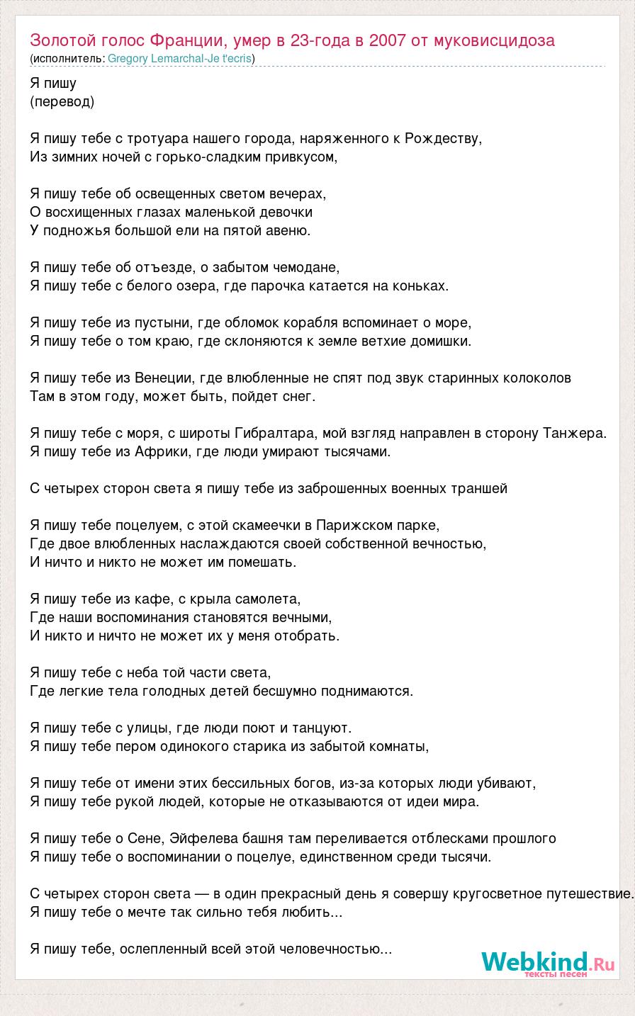 Я пишу (перевод) Я пишу тебе с тротуара нашего города, наряженного к Рождеству, Из зимних ночей с горько-сладким привкусом, Я пишу тебе об освещенных светом вечерах, О восхищенных глазах маленькой девочки У подножья большой ели на пятой авеню. Я пишу тебе об отъезде, о забытом чемодане, Я пишу тебе с белого озера, где парочка катается на коньках. Я пишу тебе из пустыни, где обломок корабля вспоминает о море, Я пишу тебе о том краю, где склоняются к земле ветхие домишки. Я пишу тебе из Венеции, где влюбленные не спят под звук старинных колоколов Там в этом году, может быть, пойдет снег. Я пишу тебе с моря, с широты Гибралтара, мой взгляд направлен в сторону Танжера. Я пишу тебе из Африки, где люди умирают тысячами. С четырех сторон света я пишу тебе из заброшенных военных траншей Я пишу тебе поцелуем, с этой скамеечки в Парижском парке, Где двое влюбленных наслаждаются своей собственной вечностью, И ничто и никто не может им помешать. Я пишу тебе из кафе, с крыла самолета, Где наши воспоминания становятся вечными, И никто и ничто не может их у меня отобрать. Я пишу тебе с неба той части света, Где легкие тела голодных детей бесшумно поднимаются. Я пишу тебе с улицы, где люди поют и танцуют. Я пишу тебе пером одинокого старика из забытой комнаты, Я пишу тебе от имени этих бессильных богов, из-за которых люди убивают, Я пишу тебе рукой людей, которые не отказываются от идеи мира. Я пишу тебе о Сене, Эйфелева башня там переливается отблесками прошлого Я пишу тебе о воспоминании о поцелуе, единственном среди тысячи. С четырех сторон света — в один прекрасный день я совершу кругосветное путешествие. Я пишу тебе о мечте так сильно тебя любить... Я пишу тебе, ослепленный всей этой человечностью...