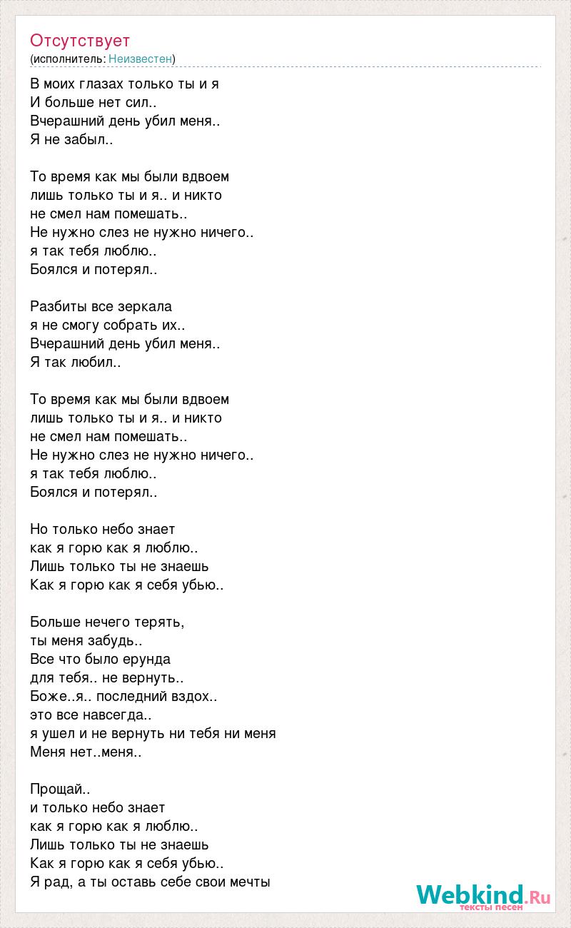 В моих глазах только ты и я И больше нет сил.. Вчерашний день убил меня.. Я не забыл.. То время как мы были вдвоем лишь только ты и я.. и никто не смел нам помешать.. Не нужно слез не нужно ничего.. я так тебя люблю.. Боялся и потерял.. Разбиты все зеркала я не смогу собрать их.. Вчерашний день убил меня.. Я так любил.. То время как мы были вдвоем лишь только ты и я.. и никто не смел нам помешать.. Не нужно слез не нужно ничего.. я так тебя люблю.. Боялся и потерял.. Но только небо знает как я горю как я люблю.. Лишь только ты не знаешь Как я горю как я себя убью.. Больше нечего терять, ты меня забудь.. Все что было ерунда для тебя.. не вернуть.. Боже..я.. последний вздох.. это все навсегда.. я ушел и не вернуть ни тебя ни меня Меня нет..меня.. Прощай.. и только небо знает как я горю как я люблю.. Лишь только ты не знаешь Как я горю как я себя убью.. Я рад, а ты оставь себе свои мечты