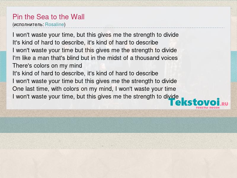 I won't waste your time, but this gives me the strength to divide It's kind of hard to describe, it's kind of hard to describe I won't waste your time but this gives me the strength to divide I'm like a man that's blind but in the midst of a thousand voices There's colors on my mind It's kind of hard to describe, it's kind of hard to describe I won't waste your time but this gives me the strength to divide One last time, with colors on my mind, I won't waste your time I won't waste your time, but this gives me the strength to divide