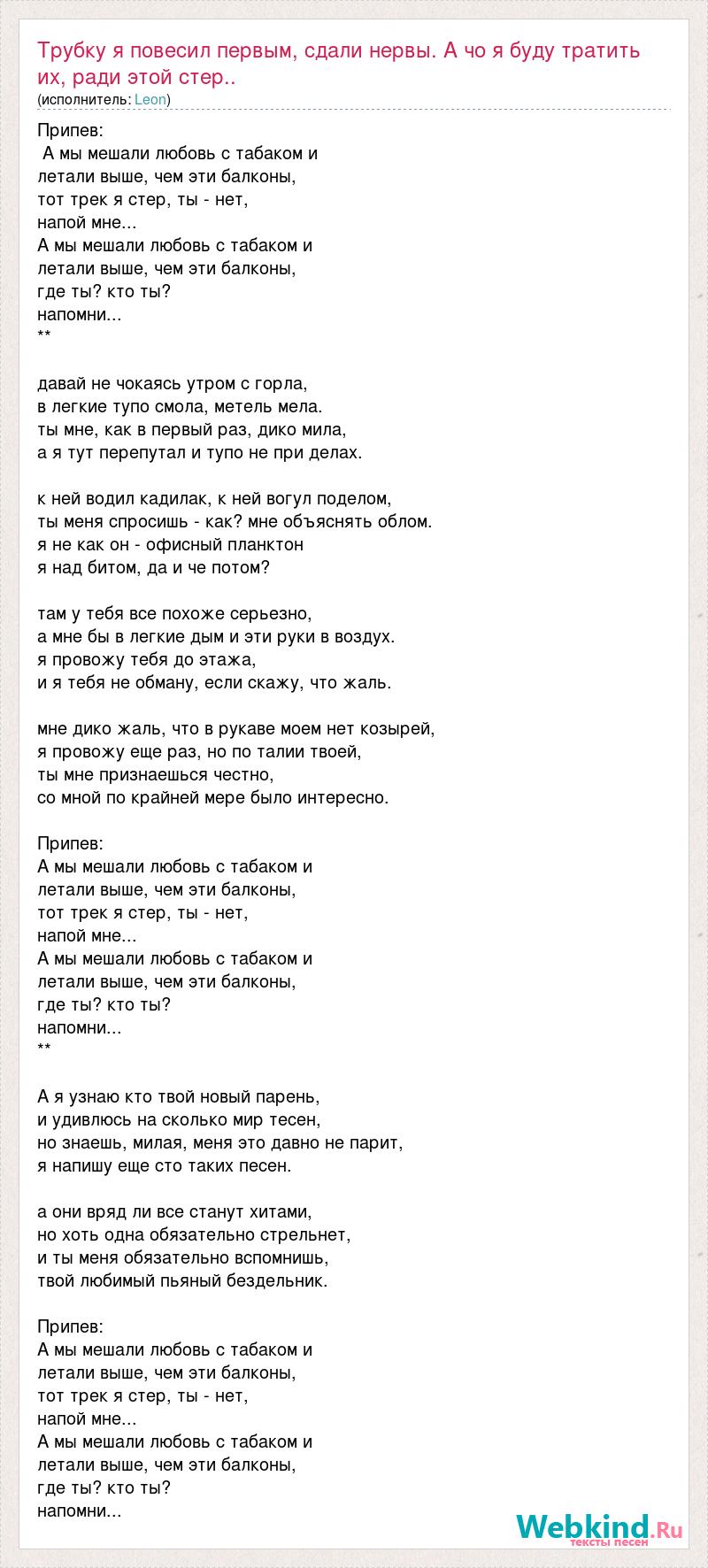 Припев: А мы мешали любовь с табаком и летали выше, чем эти балконы, тот трек я стер, ты - нет, напой мне... А мы мешали любовь с табаком и летали выше, чем эти балконы, где ты? кто ты? напомни... ** давай не чокаясь утром с горла, в легкие тупо смола, метель мела. ты мне, как в первый раз, дико мила, а я тут перепутал и тупо не при делах. к ней водил кадилак, к ней вогул поделом, ты меня спросишь - как? мне объяснять облом. я не как он - офисный планктон я над битом, да и че потом? там у тебя все похоже серьезно, а мне бы в легкие дым и эти руки в воздух. я провожу тебя до этажа, и я тебя не обману, если скажу, что жаль. мне дико жаль, что в рукаве моем нет козырей, я провожу еще раз, но по талии твоей, ты мне признаешься честно, со мной по крайней мере было интересно. Припев: А мы мешали любовь с табаком и летали выше, чем эти балконы, тот трек я стер, ты - нет, напой мне... А мы мешали любовь с табаком и летали выше, чем эти балконы, где ты? кто ты? напомни... ** А я узнаю кто твой новый парень, и удивлюсь на сколько мир тесен, но знаешь, милая, меня это давно не парит, я напишу еще сто таких песен. а они вряд ли все станут хитами, но хоть одна обязательно стрельнет, и ты меня обязательно вспомнишь, твой любимый пьяный бездельник. Припев: А мы мешали любовь с табаком и летали выше, чем эти балконы, тот трек я стер, ты - нет, напой мне... А мы мешали любовь с табаком и летали выше, чем эти балконы, где ты? кто ты? напомни...