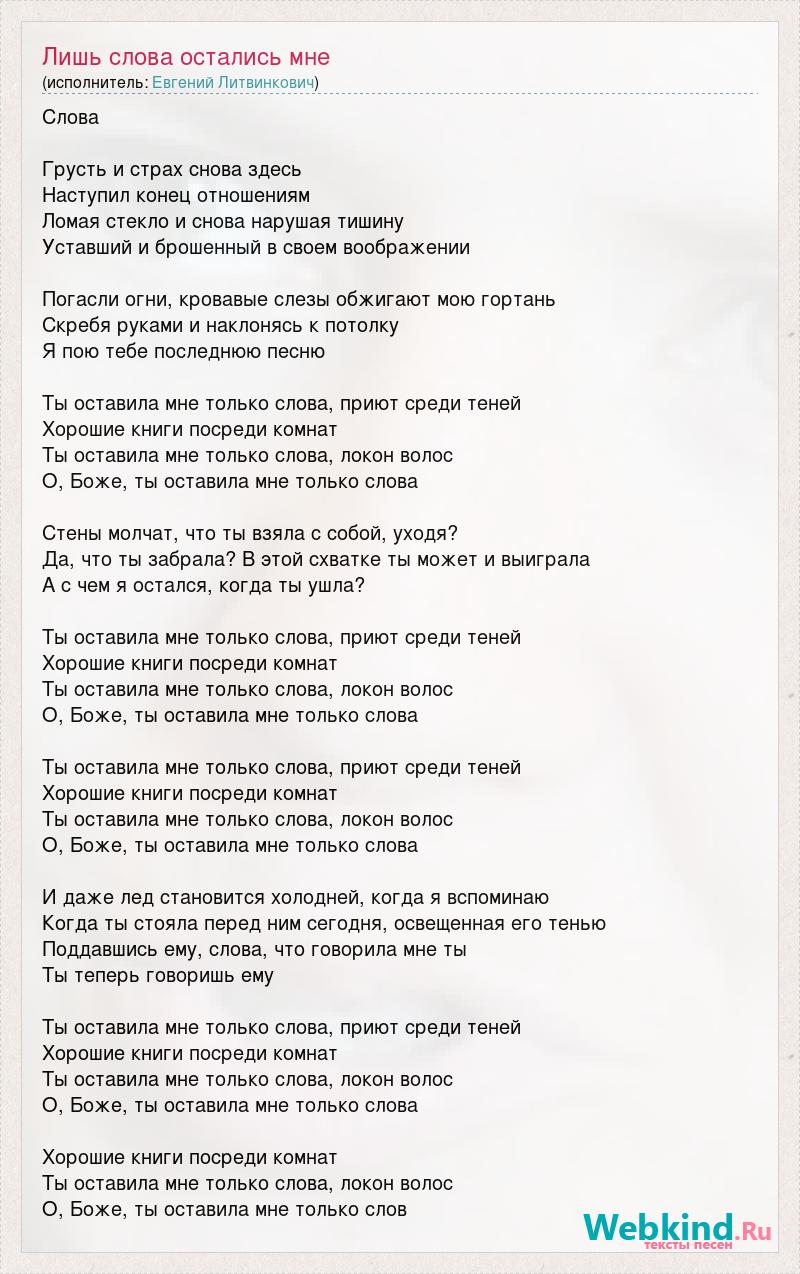 Слова Грусть и страх снова здесь Наступил конец отношениям Ломая стекло и снова нарушая тишину Уставший и брошенный в своем воображении Погасли огни, кровавые слезы обжигают мою гортань Скребя руками и наклонясь к потолку Я пою тебе последнюю песню Ты оставила мне только слова, приют среди теней Хорошие книги посреди комнат Ты оставила мне только слова, локон волос О, Боже, ты оставила мне только слова Стены молчат, что ты взяла с собой, уходя? Да, что ты забрала? В этой схватке ты может и выиграла А с чем я остался, когда ты ушла? Ты оставила мне только слова, приют среди теней Хорошие книги посреди комнат Ты оставила мне только слова, локон волос О, Боже, ты оставила мне только слова Ты оставила мне только слова, приют среди теней Хорошие книги посреди комнат Ты оставила мне только слова, локон волос О, Боже, ты оставила мне только слова И даже лед становится холодней, когда я вспоминаю Когда ты стояла перед ним сегодня, освещенная его тенью Поддавшись ему, слова, что говорила мне ты Ты теперь говоришь ему Ты оставила мне только слова, приют среди теней Хорошие книги посреди комнат Ты оставила мне только слова, локон волос О, Боже, ты оставила мне только слова Хорошие книги посреди комнат Ты оставила мне только слова, локон волос О, Боже, ты оставила мне только слов