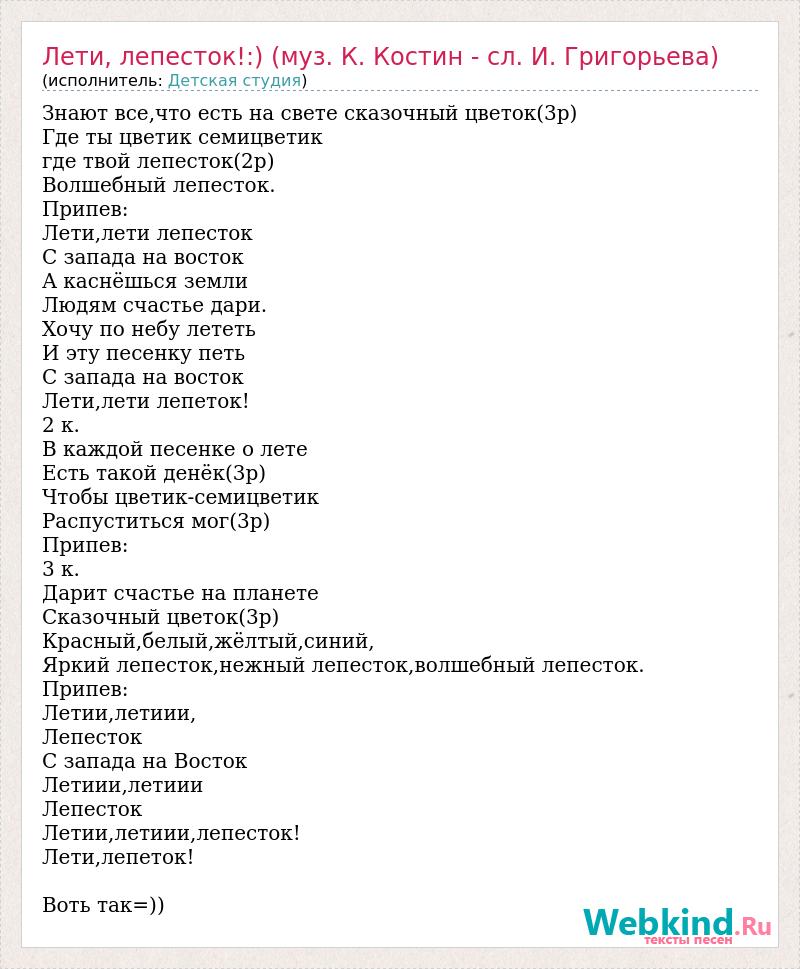 Знают все,что есть на свете сказочный цветок(3р) Где ты цветик семицветик где твой лепесток(2р) Волшебный лепесток. Припев: Лети,лети лепесток С запада на восток А каснёшься земли Людям счастье дари. Хочу по небу лететь И эту песенку петь С запада на восток Лети,лети лепеток! 2 к. В каждой песенке о лете Есть такой денёк(3р) Чтобы цветик-семицветик Распуститься мог(3р) Припев: 3 к. Дарит счастье на планете Сказочный цветок(3р) Красный,белый,жёлтый,синий, Яркий лепесток,нежный лепесток,волшебный лепесток. Припев: Летии,летиии, Лепесток С запада на Восток Летиии,летиии Лепесток Летии,летиии,лепесток! Лети,лепеток! Воть так=))