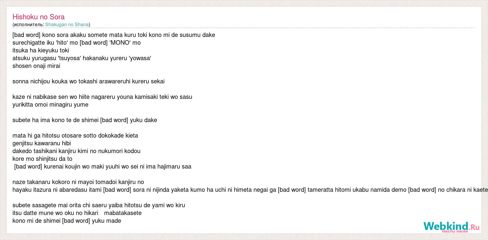 [bad word] kono sora akaku somete mata kuru toki kono mi de susumu dake surechigatte iku 'hito' mo [bad word] 'MONO' mo itsuka ha kieyuku toki atsuku yurugasu 'tsuyosa' hakanaku yureru 'yowasa' shosen onaji mirai sonna nichijou kouka wo tokashi arawareruhi kureru sekai kaze ni nabikase sen wo hiite nagareru youna kamisaki teki wo sasu yurikitta omoi minagiru yume subete ha ima kono te de shimei [bad word] yuku dake mata hi ga hitotsu otosare sotto dokokade kieta genjitsu kawaranu hibi dakedo tashikani kanjiru kimi no nukumori kodou kore mo shinjitsu da to [bad word] kurenai koujin wo maki yuuhi wo sei ni ima hajimaru saa naze takanaru kokoro ni mayoi tomadoi kanjiru no hayaku itazura ni abaredasu itami [bad word] sora ni nijinda yaketa kumo ha uchi ni himeta negai ga [bad word] tameratta hitomi ukabu namida demo [bad word] no chikara ni kaete subete sasagete mai orita chi saeru yaiba hitotsu de yami wo kiru itsu datte mune wo oku no hikari mabatakasete kono mi de shimei [bad word] yuku made