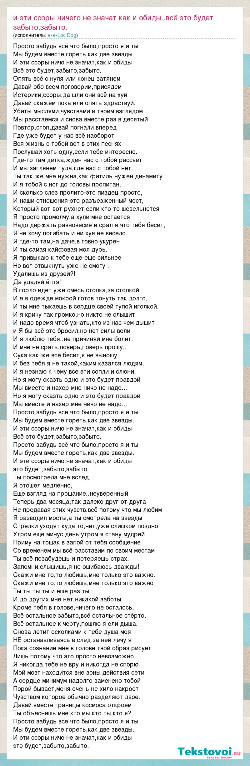Просто забудь всё что было,просто я и ты Мы будем вместе гореть,как две звезды. И эти ссоры ничо не значат,как и обиды Всё это будет,забыто,забыто. Опять всё с нуля или конец затянем Давай обо всем поговорим,присядем Истерики,ссоры,да шли они всё на хуй Давай скажем пока или опять здраствуй. Убиты мыслями,чувствами и твоим взглядом Мы расстаемся и снова вместе раз в десятый Повтор,стоп,давай погнали вперед Где уже будет у нас всё наоборот Вся жизнь с тобой вот в этих песнях Послушай хоть одну,если тебе интересно. Где-то там детка,жден нас с тобой рассвет И мы заглянем туда,где нас с тобой нет. Ты так же мне нужна,как фитиль нужен динамиту И я тобой с ног до головы пропитан. И сколько слез пролито-это пиздец просто, И наши отношения-это разъезженный мост, Который вот-вот рухнет,если кто-то шевельнется Я просто промолчу,а хули мне остается Надо держать равновесие и срал я,что тебя бесит, Я не хочу погибать и ни хуя не весело Я где-то там,на даче,в говно укурен И ты самая кайфовая моя дурь. Я привыкаю к тебе еще-еще сильнее Но вот отвыкнуть уже не смогу . Удалишь из друзей?! Да удаляй,ёптэ! В горло идет уже смесь стопка,за стопкой И я в одежде мокрой готов тонуть так долго, И ты мне тыкаешь в сердце.своей тупой иголкой. И я кричу так громко,но никто не слышит И надо время чтоб узнать,кто из нас чем дышит и Я бы всё это бросил,но нет силы воли И я люблю тебя..не причиняй мне болит. И мне не срать,поверь,поверь прошу.. Сука как же всё бесит,я не выношу. И без тебя я не такой,каким казался людям, И я незнаю к чему все эти сопли и слюни. Но я могу сказть одно и это будет правдой Мы вместе и нахер мне ничо не надо... Но я могу сказть одно и это будет правдой Мы вместе и нахер мне ничо не надо... Просто забудь всё что было,просто я и ты Мы будем вместе гореть,как две звезды. И эти ссоры ничо не значат,как и обиды Всё это будет,забыто,забыто. Просто забудь всё что было,просто я и ты Мы будем вместе гореть,как две звезды. И эти ссоры ничо не значат,как и обиды это будет,забыто,забыто. Ты посмотрела мне вслед, Я отошел медленно, Еще взгляд на прощание..неуверенный Теперь два месяца,так далеко друг от друга Не предавая этих чувств.всё потому что мы любим Я разводил мосты,а ты смотрела на звезды Стрелки уходят куда то,нет,уже слишком поздно Утром еще минус день,утром я стану мудрей Приму на тощак в запой от тебя сообщение Со временем мы всё расставим по своим местам Ты всё позабудешь и потеряешь страх. Запомни,слышишь,я не ошибаюсь дважды! Скажи мне то,то любишь,мне только это важно. Скажи мне то,то любишь,мне только это важно Ты ты ты ты и еще раз ты И до других мне нет,никакой заботы Кроме тебя в голове,ничего не осталось, Всё остальное забыто,всё остальное стёрто. Всё остальное к черту,пошлю я ели дыша. Снова летит осколками к тебе душа моя НЕ останавливаясь в след за ней лечу я Пока сознание мне в голове твой образ рисует Лишь потому что это просто невозможно Я никогда тебе не вру и никогда не спорю Мой мозг находится вне зоны действия сети А сердце минимум надолго заменено тобой Порой бывает,меня очень не хило накроет Чувством которое обычно разделяют двое. Давай вместе границы космоса откроем Ты объяснишь мне кто мы,кто ты,кто я? Просто забудь всё что было,просто я и ты Мы будем вместе гореть,как две звезды. И эти ссоры ничо не значат,как и обиды это будет,забыто,забыто.