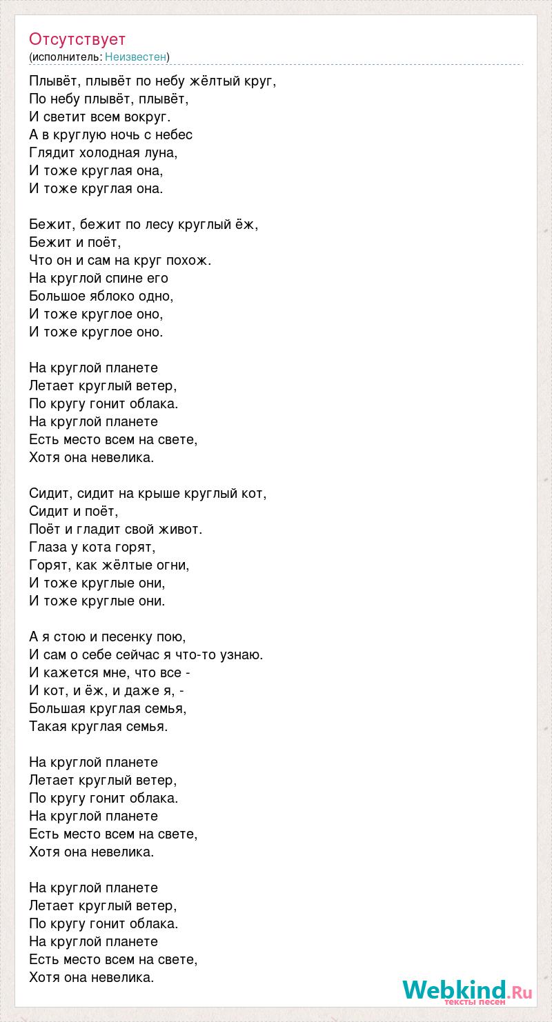Плывёт, плывёт по небу жёлтый круг, По небу плывёт, плывёт, И светит всем вокруг. А в круглую ночь с небес Глядит холодная луна, И тоже круглая она, И тоже круглая она. Бежит, бежит по лесу круглый ёж, Бежит и поёт, Что он и сам на круг похож. На круглой спине его Большое яблоко одно, И тоже круглое оно, И тоже круглое оно. На круглой планете Летает круглый ветер, По кругу гонит облака. На круглой планете Есть место всем на свете, Хотя она невелика. Сидит, сидит на крыше круглый кот, Сидит и поёт, Поёт и гладит свой живот. Глаза у кота горят, Горят, как жёлтые огни, И тоже круглые они, И тоже круглые они. А я стою и песенку пою, И сам о себе сейчас я что-то узнаю. И кажется мне, что все - И кот, и ёж, и даже я, - Большая круглая семья, Такая круглая семья. На круглой планете Летает круглый ветер, По кругу гонит облака. На круглой планете Есть место всем на свете, Хотя она невелика. На круглой планете Летает круглый ветер, По кругу гонит облака. На круглой планете Есть место всем на свете, Хотя она невелика.