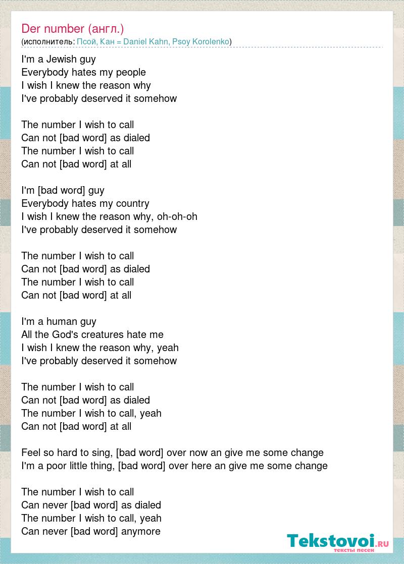 I'm a Jewish guy Everybody hates my people I wish I knew the reason why I've probably deserved it somehow The number I wish to call Can not be completed as dialed The number I wish to call Can not be completed at all I'm a Russian guy Everybody hates my country I wish I knew the reason why, oh-oh-oh I've probably deserved it somehow The number I wish to call Can not be completed as dialed The number I wish to call Can not be completed at all I'm a human guy All the God's creatures hate me I wish I knew the reason why, yeah I've probably deserved it somehow The number I wish to call Can not be completed as dialed The number I wish to call, yeah Can not be completed at all Feel so hard to sing, yeah Come over now an give me some change I'm a poor little thing, yeah Come over here an give me some change The number I wish to call Can never been completed as dialed The number I wish to call, yeah Can never be completed anymore