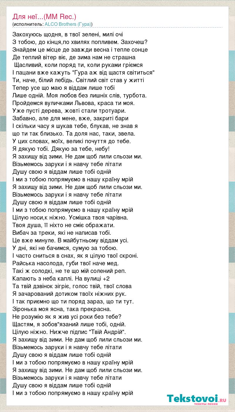 Закохуюсь щодня, в твої зелені, милі очі З тобою, до кінця,по хвилях попливем. Захочеш? Знайдем це місце де завжди весна і тепле сонце Де теплий вітер віє, де зима нам не страшна Щасливий, коли поряд ти, коли руками гріємся І пацани вже кажуть "Гура аж від щастя світиться" Ти, наче, білий лебідь. Світлий світ став у житті Тепер усе що маю я віддам лише тобі Лише одній. Моя любов без лишніх слів, турбота. Пройдемся вуличками Львова, краса ти моя. Уже пусті дерева, жовті стали тротуари. Забавно, але для мене, вже, закриті бари І скільки часу я шукав тебе, блукав, не знав я що ти так близько. Та доля нас, таки, звела. У цих словах, моїх, великі почуття до тебе. Я дякую тобі. Дякую за тебе, небу! Я захищу від зими. Не дам щоб лили сльози ми. Візьмемось заруки і я навчу тебе літати Душу свою я віддам лише тобі одній І ми з тобою попрямуємо в нашу країну мрій Я захищу від зими. Не дам щоб лили сльози ми. Візьмемось заруки і я навчу тебе літати Душу свою я віддам лише тобі одній І ми з тобою попрямуємо в нашу країну мрій Цілую носи,к ніжно. Усмішка твоя чарівна. Твоя душа, її ніхто не сміє ображати. Вибач за треки, які не написав тобі. Це вже минуле. В майбутньому віддам усі. У дні, які не бачимся, сумую за тобою. І часто сниться в снах, як я цілую твої скроні. Райська насолода, губи твої наче мед. Такі ж солодкі, не те що мій солений реп. Капають з неба каплі. На вулиці +2 Та твій дзвінок зігріє, голос твій, твої слова Я зачарований дотиком твоїх ніжних рук. І так приємно що ти поряд зараз, що ти тут. Зіронька моя ясна, така прекрасна. Не розумію як я жив усі роки без тебе? Щастям, я зобов"язаний лише тобі, одній. Цілую ніжно. Нижче підпис "Твій Андрій". Я захищу від зими. Не дам щоб лили сльози ми. Візьмемось заруки і я навчу тебе літати Душу свою я віддам лише тобі одній І ми з тобою попрямуємо в нашу країну мрій Я захищу від зими. Не дам щоб лили сльози ми. Візьмемось заруки і я навчу тебе літати Душу свою я віддам лише тобі одній І ми з тобою попрямуємо в нашу країну мрій