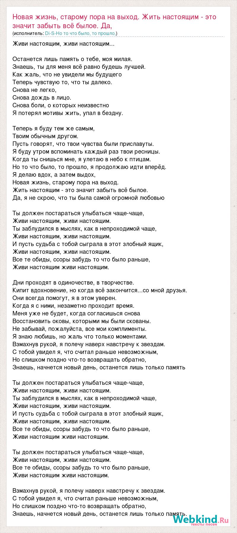 Главная→Исполнители→Di-S-Но то что было, то прошло,→Новая жизнь, старому пора на выход. Жить настоящим - это значит забыть в