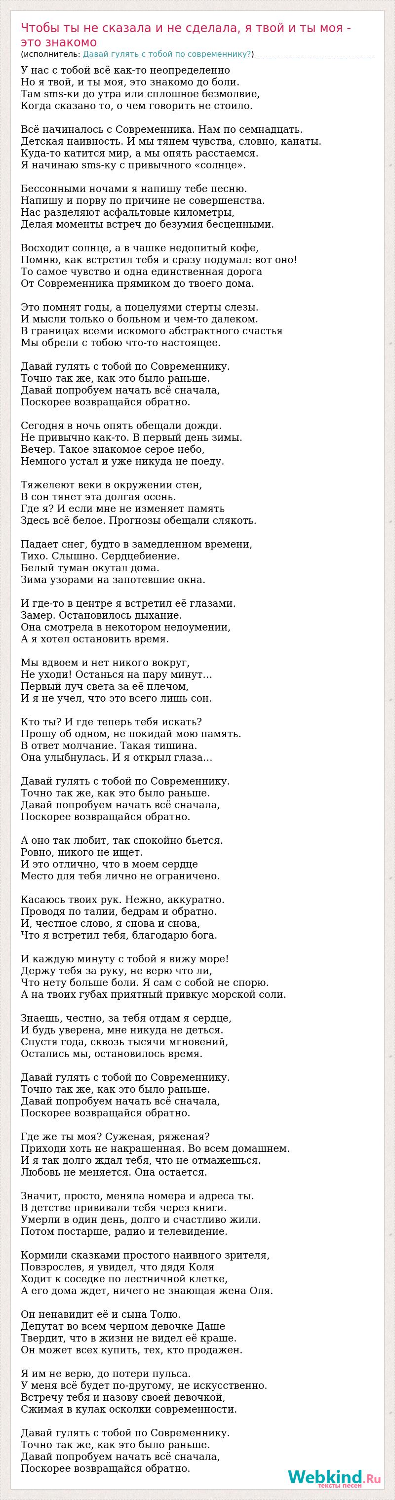 У нас с тобой всё как-то неопределенно Но я твой, и ты моя, это знакомо до боли. Там sms-ки до утра или сплошное безмолвие, Когда сказано то, о чем говорить не стоило. Всё начиналось с Современника. Нам по семнадцать. Детская наивность. И мы тянем чувства, словно, канаты. Куда-то катится мир, а мы опять расстаемся. Я начинаю sms-ку с привычного «солнце». Бессонными ночами я напишу тебе песню. Напишу и порву по причине не совершенства. Нас разделяют асфальтовые километры, Делая моменты встреч до безумия бесценными. Восходит солнце, а в чашке недопитый кофе, Помню, как встретил тебя и сразу подумал: вот оно! То самое чувство и одна единственная дорога От Современника прямиком до твоего дома. Это помнят годы, а поцелуями стерты слезы. И мысли только о больном и чем-то далеком. В границах всеми искомого абстрактного счастья Мы обрели с тобою что-то настоящее. Давай гулять с тобой по Современнику. Точно так же, как это было раньше. Давай попробуем начать всё сначала, Поскорее возвращайся обратно. Сегодня в ночь опять обещали дожди. Не привычно как-то. В первый день зимы. Вечер. Такое знакомое серое небо, Немного устал и уже никуда не поеду. Тяжелеют веки в окружении стен, В сон тянет эта долгая осень. Где я? И если мне не изменяет память Здесь всё белое. Прогнозы обещали слякоть. Падает снег, будто в замедленном времени, Тихо. Слышно. Сердцебиение. Белый туман окутал дома. Зима узорами на запотевшие окна. И где-то в центре я встретил её глазами. Замер. Остановилось дыхание. Она смотрела в некотором недоумении, А я хотел остановить время. Мы вдвоем и нет никого вокруг, Не уходи! Останься на пару минут… Первый луч света за её плечом, И я не учел, что это всего лишь сон. Кто ты? И где теперь тебя искать? Прошу об одном, не покидай мою память. В ответ молчание. Такая тишина. Она улыбнулась. И я открыл глаза… Давай гулять с тобой по Современнику. Точно так же, как это было раньше. Давай попробуем начать всё сначала, Поскорее возвращайся обратно. А оно так любит, так спокойно бьется. Ровно, никого не ищет. И это отлично, что в моем сердце Место для тебя лично не ограничено. Касаюсь твоих рук. Нежно, аккуратно. Проводя по талии, бедрам и обратно. И, честное слово, я снова и снова, Что я встретил тебя, благодарю бога. И каждую минуту с тобой я вижу море! Держу тебя за руку, не верю что ли, Что нету больше боли. Я сам с собой не спорю. А на твоих губах приятный привкус морской соли. Знаешь, честно, за тебя отдам я сердце, И будь уверена, мне никуда не деться. Спустя года, сквозь тысячи мгновений, Остались мы, остановилось время. Давай гулять с тобой по Современнику. Точно так же, как это было раньше. Давай попробуем начать всё сначала, Поскорее возвращайся обратно. Где же ты моя? Суженая, ряженая? Приходи хоть не накрашенная. Во всем домашнем. И я так долго ждал тебя, что не отмажешься. Любовь не меняется. Она остается. Значит, просто, меняла номера и адреса ты. В детстве прививали тебя через книги. Умерли в один день, долго и счастливо жили. Потом постарше, радио и телевидение. Кормили сказками простого наивного зрителя, Повзрослев, я увидел, что дядя Коля Ходит к соседке по лестничной клетке, А его дома ждет, ничего не знающая жена Оля. Он ненавидит её и сына Толю. Депутат во всем черном девочке Даше Твердит, что в жизни не видел её краше. Он может всех купить, тех, кто продажен. Я им не верю, до потери пул