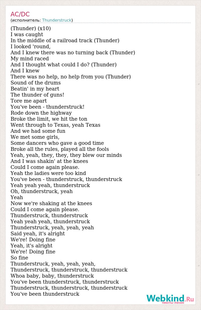 (Thunder) (x10) I was caught In the middle of a railroad track (Thunder) I looked 'round, And I knew there was no turning back (Thunder) My mind raced And I thought what could I do? (Thunder) And I knew There was no help, no help from you (Thunder) Sound of the drums Beatin' in my heart The thunder of guns! Tore me apart You've been - thunderstruck! Rode down the highway Broke the limit, we hit the ton Went through to Texas, yeah Texas And we had some fun We met some girls, Some dancers who gave a good time Broke all the rules, played all the fools Yeah, yeah, they, they, they blew our minds And I was shakin' at the knees Could I come again please. Yeah the ladies were too kind You've been - thunderstruck, thunderstruck Yeah yeah yeah, thunderstruck Oh, thunderstruck, yeah Yeah Now we're shaking at the knees Could I come again please. Thunderstruck, thunderstruck Yeah yeah yeah, thunderstruck Thunderstruck, yeah, yeah, yeah Said yeah, it's alright We're! Doing fine Yeah, it's alright We're! Doing fine So fine Thunderstruck, yeah, yeah, yeah, Thunderstruck, thunderstruck, thunderstruck Whoa baby, baby, thunderstruck You've been thunderstruck, thunderstruck Thunderstruck, thunderstruck, thunderstruck You've been thunderstruck