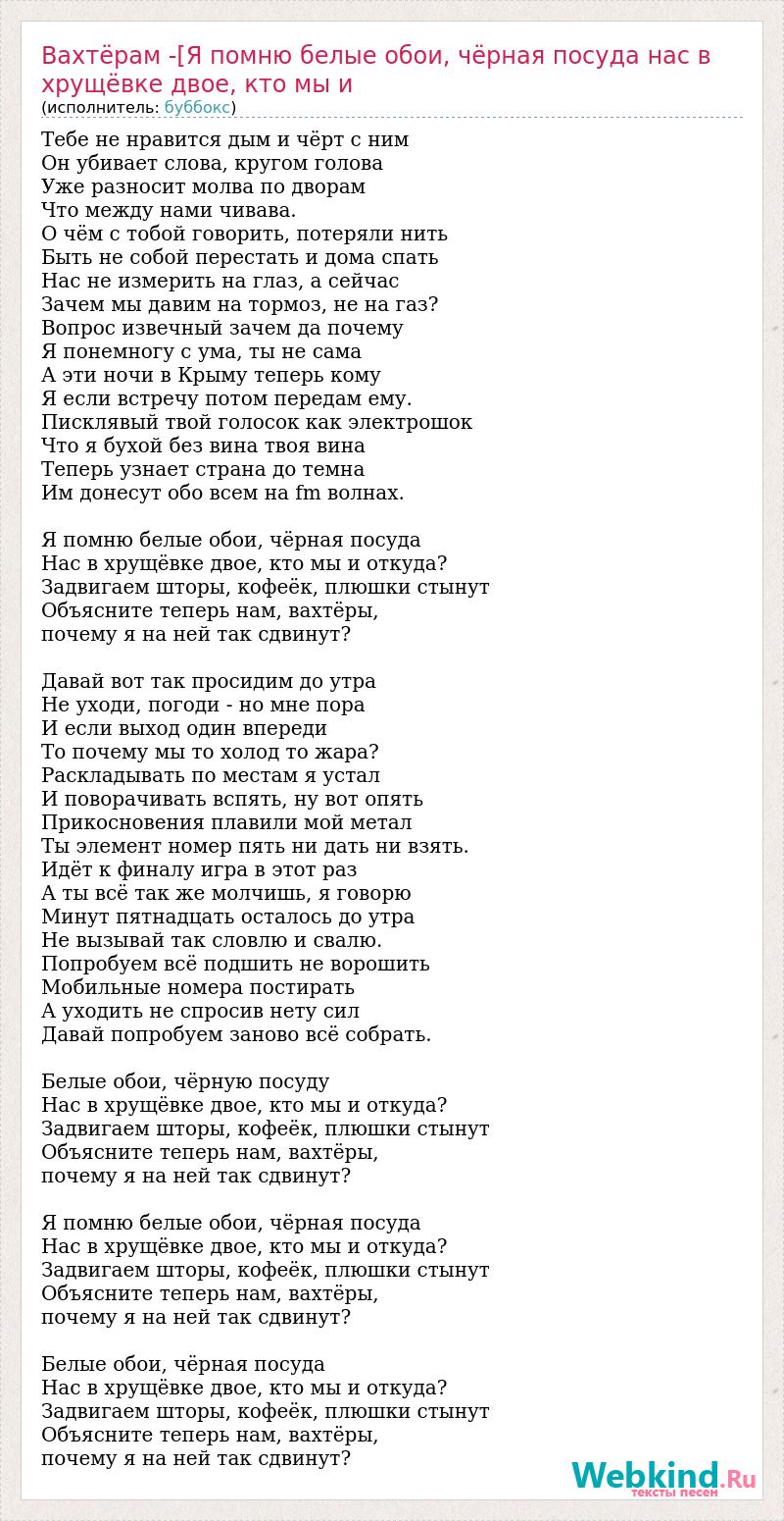 Тебе не нравится дым и чёрт с ним Он убивает слова, кругом голова Уже разносит молва по дворам Что между нами чивава. О чём с тобой говорить, потеряли нить Быть не собой перестать и дома спать Нас не измерить на глаз, а сейчас Зачем мы давим на тормоз, не на газ? Вопрос извечный зачем да почему Я понемногу с ума, ты не сама А эти ночи в Крыму теперь кому Я если встречу потом передам ему. Писклявый твой голосок как электрошок Что я бухой без вина твоя вина Теперь узнает страна до темна Им донесут обо всем на fm волнах. Я помню белые обои, чёрная посуда Нас в хрущёвке двое, кто мы и откуда? Задвигаем шторы, кофеёк, плюшки стынут Объясните теперь нам, вахтёры, почему я на ней так сдвинут? Давай вот так просидим до утра Не уходи, погоди - но мне пора И если выход один впереди То почему мы то холод то жара? Раскладывать по местам я устал И поворачивать вспять, ну вот опять Прикосновения плавили мой метал Ты элемент номер пять ни дать ни взять. Идёт к финалу игра в этот раз А ты всё так же молчишь, я говорю Минут пятнадцать осталось до утра Не вызывай так словлю и свалю. Попробуем всё подшить не ворошить Мобильные номера постирать А уходить не спросив нету сил Давай попробуем заново всё собрать. Белые обои, чёрную посуду Нас в хрущёвке двое, кто мы и откуда? Задвигаем шторы, кофеёк, плюшки стынут Объясните теперь нам, вахтёры, почему я на ней так сдвинут? Я помню белые обои, чёрная посуда Нас в хрущёвке двое, кто мы и откуда? Задвигаем шторы, кофеёк, плюшки стынут Объясните теперь нам, вахтёры, почему я на ней так сдвинут? Белые обои, чёрная посуда Нас в хрущёвке двое, кто мы и откуда? Задвигаем шторы, кофеёк, плюшки стынут Объясните теперь нам, вахтёры, почему я на ней так сдвинут?