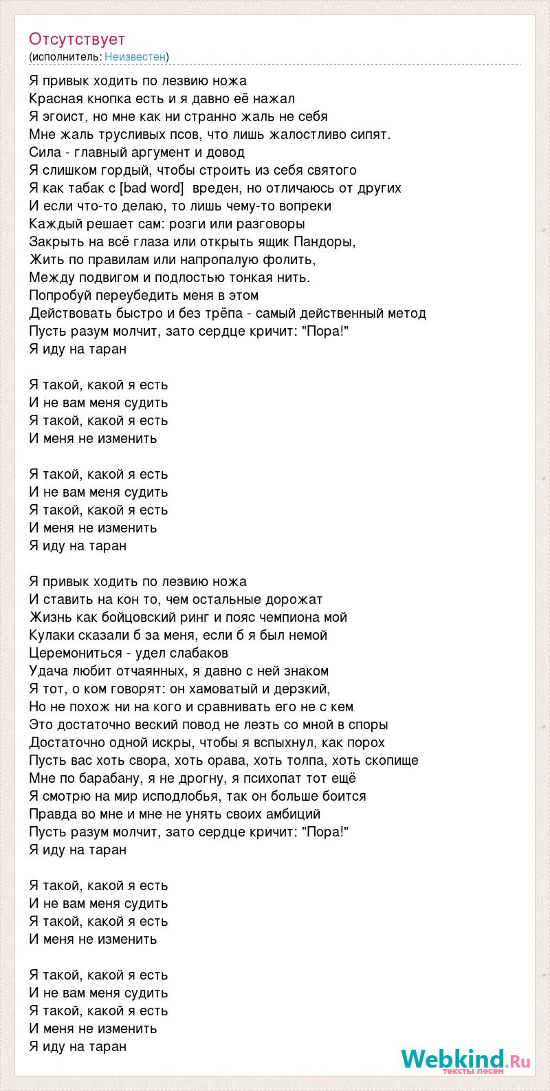 Я привык ходить по лезвию ножа Красная кнопка есть и я давно её нажал Я эгоист, но мне как ни странно жаль не себя Мне жаль трусливых псов, что лишь жалостливо сипят. Сила - главный аргумент и довод Я слишком гордый, чтобы строить из себя святого Я как табак с [bad word] вреден, но отличаюсь от других И если что-то делаю, то лишь чему-то вопреки Каждый решает сам: розги или разговоры Закрыть на всё глаза или открыть ящик Пандоры, Жить по правилам или напропалую фолить, Между подвигом и подлостью тонкая нить. Попробуй переубедить меня в этом Действовать быстро и без трёпа - самый действенный метод Пусть разум молчит, зато сердце кричит: "Пора!" Я иду на таран Я такой, какой я есть И не вам меня судить Я такой, какой я есть И меня не изменить Я такой, какой я есть И не вам меня судить Я такой, какой я есть И меня не изменить Я иду на таран Я привык ходить по лезвию ножа И ставить на кон то, чем остальные дорожат Жизнь как бойцовский ринг и пояс чемпиона мой Кулаки сказали б за меня, если б я был немой Церемониться - удел слабаков Удача любит отчаянных, я давно с ней знаком Я тот, о ком говорят: он хамоватый и дерзкий, Но не похож ни на кого и сравнивать его не с кем Это достаточно веский повод не лезть со мной в споры Достаточно одной искры, чтобы я вспыхнул, как порох Пусть вас хоть свора, хоть орава, хоть толпа, хоть скопище Мне по барабану, я не дрогну, я психопат тот ещё Я смотрю на мир исподлобья, так он больше боится Правда во мне и мне не унять своих амбиций Пусть разум молчит, зато сердце кричит: "Пора!" Я иду на таран Я такой, какой я есть И не вам меня судить Я такой, какой я есть И меня не изменить Я такой, какой я есть И не вам меня судить Я такой, какой я есть И меня не изменить Я иду на таран
