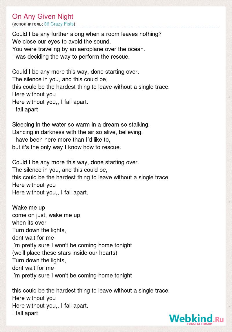 Could I be any further along when a room leaves nothing? We close our eyes to avoid the sound. You were traveling by an aeroplane over the ocean. I was deciding the way to perform the rescue. Could I be any more this way, done starting over. The silence in you, and this could be, this could be the hardest thing to leave without a single trace. Here without you Here without you,, I fall apart. I fall apart Sleeping in the water so warm in a dream so stalking. Dancing in darkness with the air so alive, believing. I have been here more than I’d like to, but it's the only way I know how to rescue. Could I be any more this way, done starting over. The silence in you, and this could be, this could be the hardest thing to leave without a single trace. Here without you Here without you,, I fall apart. Wake me up come on just, wake me up when its over Turn down the lights, dont wait for me I’m pretty sure I won't be coming home tonight (we’ll place these stars inside our hearts) Turn down the lights, dont wait for me I’m pretty sure I won't be coming home tonight this could be the hardest thing to leave without a single trace. Here without you Here without you,, I fall apart. I fall apart