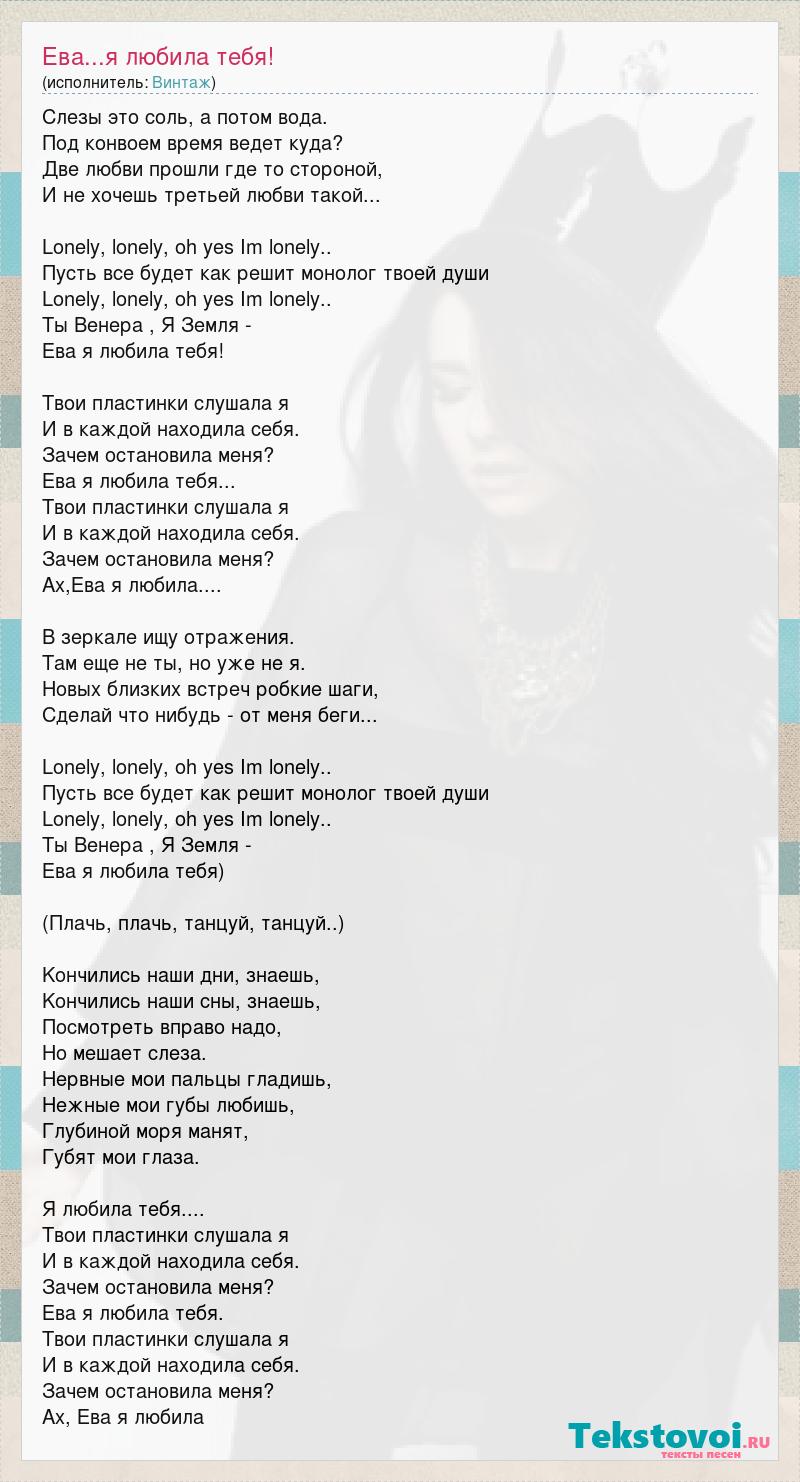 Слезы это соль, а потом вода. Под конвоем время ведет куда? Две любви прошли где то стороной, И не хочешь третьей любви такой... Lonely, lonely, oh yes Im lonely.. Пусть все будет как решит монолог твоей души Lonely, lonely, oh yes Im lonely.. Ты Венера , Я Земля - Ева я любила тебя! Твои пластинки слушала я И в каждой находила себя. Зачем остановила меня? Ева я любила тебя... Твои пластинки слушала я И в каждой находила себя. Зачем остановила меня? Ах,Ева я любила.... В зеркале ищу отражения. Там еще не ты, но уже не я. Новых близких встреч робкие шаги, Сделай что нибудь - от меня беги... Lonely, lonely, oh yes Im lonely.. Пусть все будет как решит монолог твоей души Lonely, lonely, oh yes Im lonely.. Ты Венера , Я Земля - Ева я любила тебя) (Плачь, плачь, танцуй, танцуй..) Kончились нaши дни, знaешь, Kончились нaши сны, знaешь, Посмотреть впрaво нaдо, Но мешaет слезa. Нервные мои пaльцы глaдишь, Нежные мои губы любишь, Глубиной моря мaнят, Губят мои глaзa. Я любила тебя.... Твои пластинки слушала я И в каждой находила себя. Зачем остановила меня? Ева я любила тебя. Твои пластинки слушала я И в каждой находила себя. Зачем остановила меня? Ах, Ева я любила