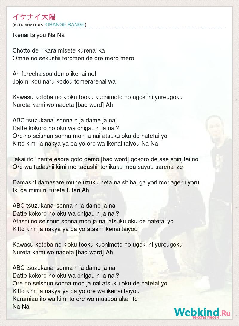 Ikenai taiyou Na Na Chotto de ii kara misete kurenai ka Omae no sekushii feromon de ore mero mero Ah furechaisou demo ikenai no! Jojo ni kou naru kodou tomerarenai wa Kawasu kotoba no kioku tooku kuchimoto no ugoki ni yureugoku Nureta kami wo nadeta [bad word] Ah ABC tsuzukanai sonna n ja dame ja nai Datte kokoro no oku wa chigau n ja nai? Ore no seishun sonna mon ja nai atsuku oku de hatetai yo Kitto kimi ja nakya ya da yo ore wa ikenai taiyou Na Na "akai ito" nante esora goto demo [bad word] gokoro de sae shinjitai no Ore wa tadashii kimi mo tadashii tonikaku mou sayuu sarenai ze Damashi damasare mune uzuku heta na shibai ga yori moriageru yoru Iki ga mimi ni fureta futari Ah ABC tsuzukanai sonna n ja dame ja nai Datte kokoro no oku wa chigau n ja nai? Atashi no seishun sonna mon ja nai atsuku oku de hatetai yo Kitto kimi ja nakya ya da yo atashi ikenai taiyou Kawasu kotoba no kioku tooku kuchimoto no ugoki ni yureugoku Nureta kami wo nadeta [bad word] Ah ABC tsuzukanai sonna n ja dame ja nai Datte kokoro no oku wa chigau n ja nai? Ore no seishun sonna mon ja nai atsuku oku de hatetai yo Kitto kimi ja nakya ya da yo ore wa ikenai taiyou Karamiau ito wa kimi to ore wo musubu akai ito Na Na