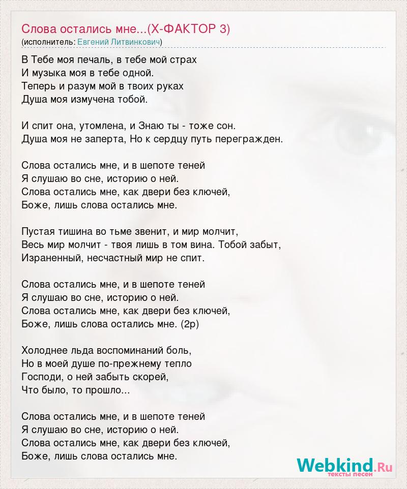 В Тебе моя печаль, в тебе мой страх И музыка моя в тебе одной. Теперь и разум мой в твоих руках Душа моя измучена тобой. И спит она, утомлена, и Знаю ты - тоже сон. Душа моя не заперта, Но к сердцу путь перегражден. Слова остались мне, и в шепоте теней Я слушаю во сне, историю о ней. Слова остались мне, как двери без ключей, Боже, лишь слова остались мне. Пустая тишина во тьме звенит, и мир молчит, Весь мир молчит - твоя лишь в том вина. Тобой забыт, Израненный, несчастный мир не спит. Слова остались мне, и в шепоте теней Я слушаю во сне, историю о ней. Слова остались мне, как двери без ключей, Боже, лишь слова остались мне. (2р) Холоднее льда воспоминаний боль, Но в моей душе по-прежнему тепло Господи, о ней забыть скорей, Что было, то прошло... Слова остались мне, и в шепоте теней Я слушаю во сне, историю о ней. Слова остались мне, как двери без ключей, Боже, лишь слова остались мне.
