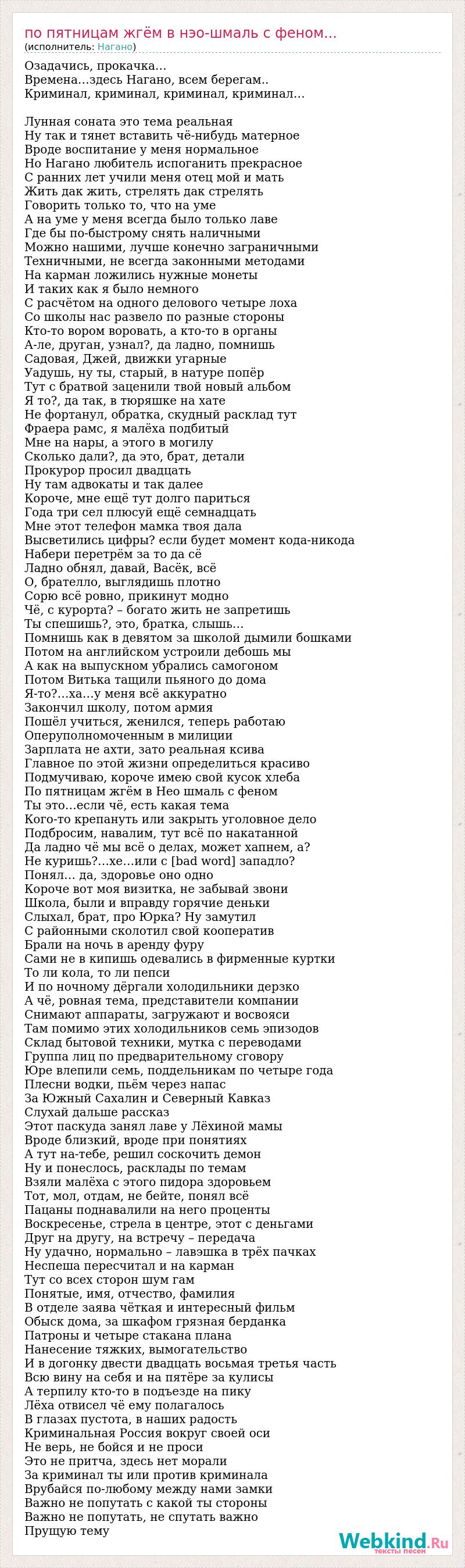 Озадачись, прокачка… Времена…здесь Нагано, всем берегам.. Криминал, криминал, криминал, криминал… Лунная соната это тема реальная Ну так и тянет вставить чё-нибудь матерное Вроде воспитание у меня нормальное Но Нагано любитель испоганить прекрасное С ранних лет учили меня отец мой и мать Жить дак жить, стрелять дак стрелять Говорить только то, что на уме А на уме у меня всегда было только лаве Где бы по-быстрому снять наличными Можно нашими, лучше конечно заграничными Техничными, не всегда законными методами На карман ложились нужные монеты И таких как я было немного С расчётом на одного делового четыре лоха Со школы нас развело по разные стороны Кто-то вором воровать, а кто-то в органы А-ле, друган, узнал?, да ладно, помнишь Садовая, Джей, движки угарные Уадушь, ну ты, старый, в натуре попёр Тут с братвой заценили твой новый альбом Я то?, да так, в тюряшке на хате Не фортанул, обратка, скудный расклад тут Фраера рамс, я малёха подбитый Мне на нары, а этого в могилу Сколько дали?, да это, брат, детали Прокурор просил двадцать Ну там адвокаты и так далее Короче, мне ещё тут долго париться Года три сел плюсуй ещё семнадцать Мне этот телефон мамка твоя дала Высветились цифры? если будет момент кода-никода Набери перетрём за то да сё Ладно обнял, давай, Васёк, всё О, брателло, выглядишь плотно Сорю всё ровно, прикинут модно Чё, с курорта? – богато жить не запретишь Ты спешишь?, это, братка, слышь… Помнишь как в девятом за школой дымили бошками Потом на английском устроили дебошь мы А как на выпускном убрались самогоном Потом Витька тащили пьяного до дома Я-то?…ха…у меня всё аккуратно Закончил школу, потом армия Пошёл учиться, женился, теперь работаю Оперуполномоченным в милиции Зарплата не ахти, зато реальная ксива Главное по этой жизни определиться красиво Подмучиваю, короче имею свой кусок хлеба По пятницам жгём в Нео шмаль с феном Ты это…если чё, есть какая тема Кого-то крепануть или закрыть уголовное дело Подбросим, навалим, тут всё по накатанной Да ладно чё мы всё о делах, может хапнем, а? Не куришь?…хе…или с [bad word] западло? Понял… да, здоровье оно одно Короче вот моя визитка, не забывай звони Школа, были и вправду горячие деньки Слыхал, брат, про Юрка? Ну замутил С районными сколотил свой кооператив Брали на ночь в аренду фуру Сами не в кипишь одевались в фирменные куртки То ли кола, то ли пепси И по ночному дёргали холодильники дерзко А чё, ровная тема, представители компании Снимают аппараты, загружают и восвояси Там помимо этих холодильников семь эпизодов Склад бытовой техники, мутка с переводами Группа лиц по предварительному сговору Юре влепили семь, поддельникам по четыре года Плесни водки, пьём через напас За Южный Сахалин и Северный Кавказ Слухай дальше рассказ Этот паскуда занял лаве у Лёхиной мамы Вроде близкий, вроде при понятиях А тут на-тебе, решил соскочить демон Ну и понеслось, расклады по темам Взяли малёха с этого пидора здоровьем Тот, мол, отдам, не бейте, понял всё Пацаны поднавалили на него проценты Воскресенье, стрела в центре, этот с деньгами Друг на другу, на встречу – передача Ну удачно, нормально – лавэшка в трёх пачках Неспеша пересчитал и на карман Тут со всех сторон шум гам Понятые, имя, отчество, фамилия В отделе заява чёткая и интересный фильм Обыск дома, за шкафом грязная берданка Патроны и четыре стакана плана Нанесе