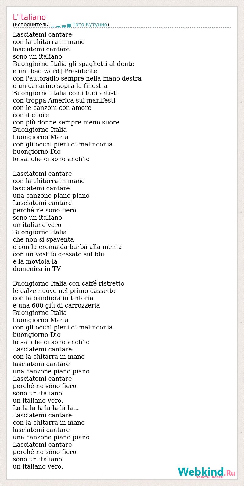 Lasciatemi cantare con la chitarra in mano lasciatemi cantare sono un italiano Buongiorno Italia gli spaghetti al dente e un [bad word] Presidente con l'autoradio sempre nella mano destra e un canarino sopra la finestra Buongiorno Italia con i tuoi artisti con troppa America sui manifesti con le canzoni con amore con il cuore con più donne sempre meno suore Buongiorno Italia buongiorno Maria con gli occhi pieni di malinconia buongiorno Dio lo sai che ci sono anch'io Lasciatemi cantare con la chitarra in mano lasciatemi cantare una canzone piano piano Lasciatemi cantare perché ne sono fiero sono un italiano un italiano vero Buongiorno Italia che non si spaventa e con la crema da barba alla menta con un vestito gessato sul blu e la moviola la domenica in TV Buongiorno Italia con caffé ristretto le calze nuove nel primo cassetto con la bandiera in tintoria e una 600 giù di carrozzeria Buongiorno Italia buongiorno Maria con gli occhi pieni di malinconia buongiorno Dio lo sai che ci sono anch'io Lasciatemi cantare con la chitarra in mano lasciatemi cantare una canzone piano piano Lasciatemi cantare perché ne sono fiero sono un italiano un italiano vero. La la la la la la la la... Lasciatemi cantare con la chitarra in mano lasciatemi cantare una canzone piano piano Lasciatemi cantare perché ne sono fiero sono un italiano un italiano vero.