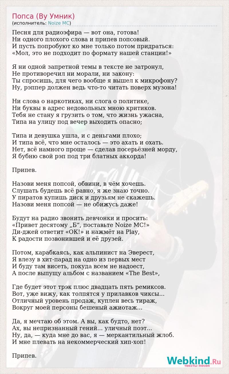 Песня для радиоэфира — вот она, готова! Ни одного плохого слова и припев попсовый. И пусть попробуют ко мне только потом придраться: «Мол, это не подходит по формату нашей станции!» Я ни одной запретной темы в тексте не затронул, Не противоречил ни морали, ни закону: Ты спросишь, для чего вообще я вышел к микрофону? Ну, рэппер должен ведь что-то читать поверх музона! Ни слова о наркотиках, ни слога о политике, Ни буквы в адрес недовольных мною критиков. Тебя не стану я грузить о том, что жизнь ужасна, Типа на улицу под вечер выходить опасно; Типа и девушка ушла, и с деньгами плохо; И типа всё, что мне осталось — это ахать и охать. Нет, всё намного проще — сделав посерьёзней морду, Я бубню свой рэп под три блатных аккорда! Припев. Назови меня попсой, обвини, в чём хочешь. Слушать будешь всё равно, я же знаю точно. У пиратов купишь диск и друзьям не скажешь. Назови меня попсой — не обижусь даже! Будут на радио звонить девчонки и просить: «Привет десятому „Б“, поставьте Noize MC!» Ди-джей ответит «ОК!» и нажмёт на Play, К радости позвонившей и её друзей. Потом, карабкаясь, как альпинист на Эверест, Я влезу в хит-парад на одно из первых мест И буду там висеть, покуда всем не надоест, А после выпущу альбом с названием «The Best», Где будет этот трэк плюс двадцать пять ремиксов. Вот, уже вижу, как толпятся у прилавков чиксы... Отличный уровень продаж, куплен весь тираж, Вокруг моей персоны бешеный ажиотаж... Да, я мечтаю об этом. А вы, как будто, нет? Ах, вы непризнанный гений... уличный поэт... Ну, да, — куда мне до вас, я — меркантильный жлоб. И мне плевать на некоммерческий хип-хоп! Припев.