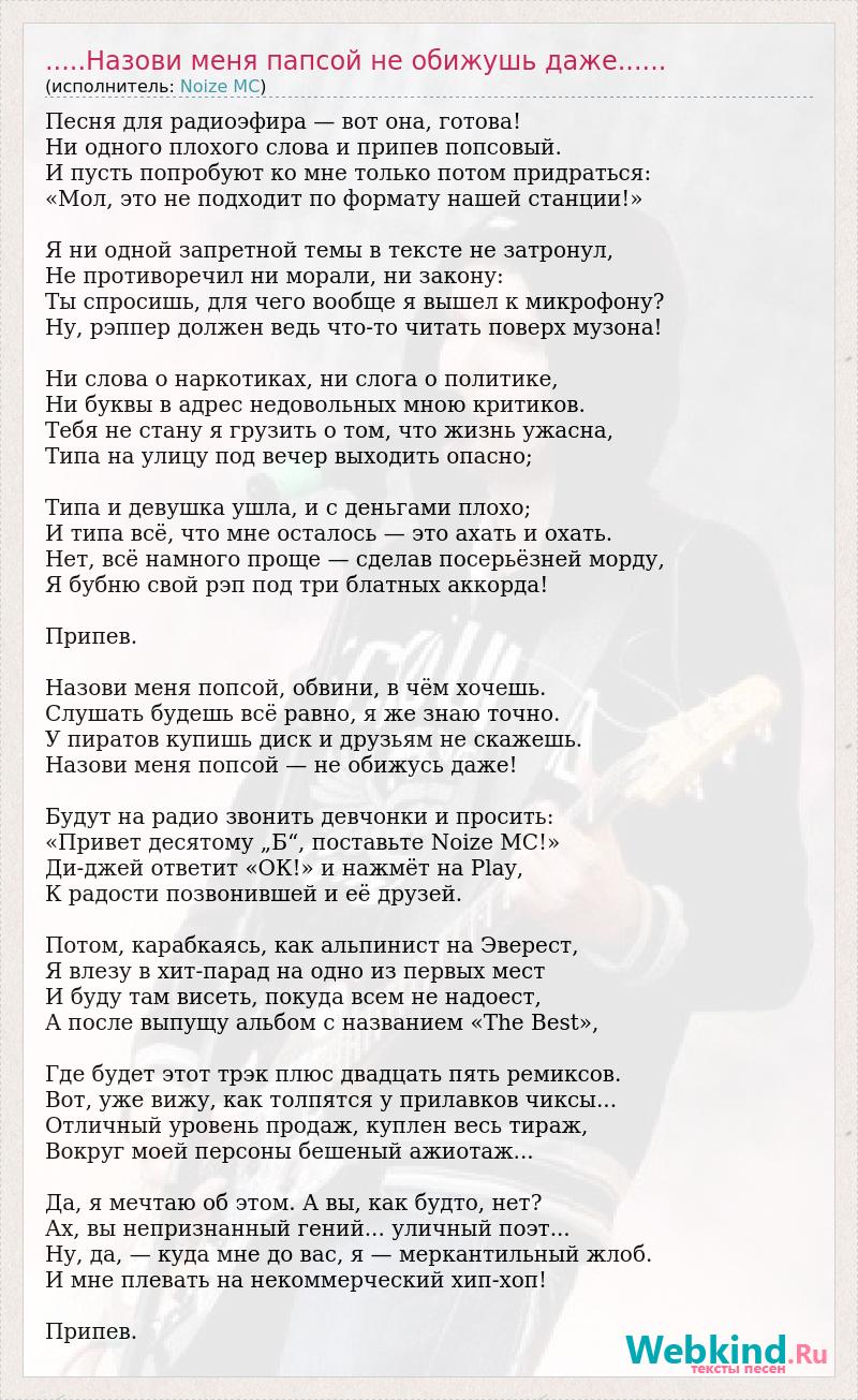 Песня для радиоэфира — вот она, готова! Ни одного плохого слова и припев попсовый. И пусть попробуют ко мне только потом придраться: «Мол, это не подходит по формату нашей станции!» Я ни одной запретной темы в тексте не затронул, Не противоречил ни морали, ни закону: Ты спросишь, для чего вообще я вышел к микрофону? Ну, рэппер должен ведь что-то читать поверх музона! Ни слова о наркотиках, ни слога о политике, Ни буквы в адрес недовольных мною критиков. Тебя не стану я грузить о том, что жизнь ужасна, Типа на улицу под вечер выходить опасно; Типа и девушка ушла, и с деньгами плохо; И типа всё, что мне осталось — это ахать и охать. Нет, всё намного проще — сделав посерьёзней морду, Я бубню свой рэп под три блатных аккорда! Припев. Назови меня попсой, обвини, в чём хочешь. Слушать будешь всё равно, я же знаю точно. У пиратов купишь диск и друзьям не скажешь. Назови меня попсой — не обижусь даже! Будут на радио звонить девчонки и просить: «Привет десятому „Б“, поставьте Noize MC!» Ди-джей ответит «ОК!» и нажмёт на Play, К радости позвонившей и её друзей. Потом, карабкаясь, как альпинист на Эверест, Я влезу в хит-парад на одно из первых мест И буду там висеть, покуда всем не надоест, А после выпущу альбом с названием «The Best», Где будет этот трэк плюс двадцать пять ремиксов. Вот, уже вижу, как толпятся у прилавков чиксы... Отличный уровень продаж, куплен весь тираж, Вокруг моей персоны бешеный ажиотаж... Да, я мечтаю об этом. А вы, как будто, нет? Ах, вы непризнанный гений... уличный поэт... Ну, да, — куда мне до вас, я — меркантильный жлоб. И мне плевать на некоммерческий хип-хоп! Припев.
