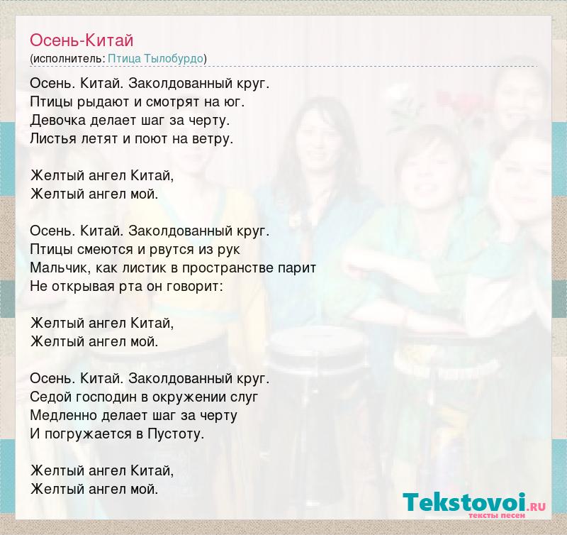 Осень. Китай. Заколдованный круг. Птицы рыдают и смотрят на юг. Девочка делает шаг за черту. Листья летят и поют на ветру. Желтый ангел Китай, Желтый ангел мой. Осень. Китай. Заколдованный круг. Птицы смеются и рвутся из рук Мальчик, как листик в пространстве парит Не открывая рта он говорит: Желтый ангел Китай, Желтый ангел мой. Осень. Китай. Заколдованный круг. Седой господин в окружении слуг Медленно делает шаг за черту И погружается в Пустоту. Желтый ангел Китай, Желтый ангел мой.