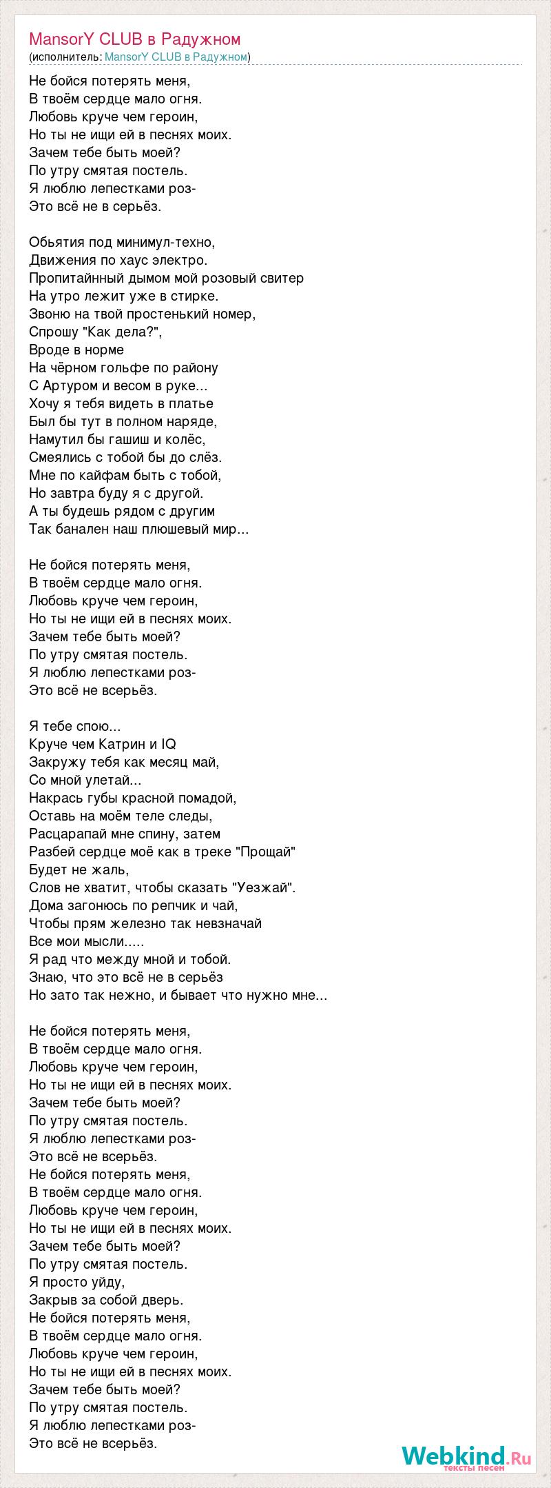 Не бойся потерять меня, В твоём сердце мало огня. Любовь круче чем героин, Но ты не ищи ей в песнях моих. Зачем тебе быть моей? По утру смятая постель. Я люблю лепестками роз- Это всё не в серьёз. Обьятия под минимул-техно, Движения по хаус электро. Пропитайнный дымом мой розовый свитер На утро лежит уже в стирке. Звоню на твой простенький номер, Спрошу "Как дела?", Вроде в норме На чёрном гольфе по району С Артуром и весом в руке... Хочу я тебя видеть в платье Был бы тут в полном наряде, Намутил бы гашиш и колёс, Смеялись с тобой бы до слёз. Мне по кайфам быть с тобой, Но завтра буду я с другой. А ты будешь рядом с другим Так банален наш плюшевый мир... Не бойся потерять меня, В твоём сердце мало огня. Любовь круче чем героин, Но ты не ищи ей в песнях моих. Зачем тебе быть моей? По утру смятая постель. Я люблю лепестками роз- Это всё не всерьёз. Я тебе спою... Круче чем Катрин и IQ Закружу тебя как месяц май, Со мной улетай... Накрась губы красной помадой, Оставь на моём теле следы, Расцарапай мне спину, затем Разбей сердце моё как в треке "Прощай" Будет не жаль, Слов не хватит, чтобы сказать "Уезжай". Дома загонюсь по репчик и чай, Чтобы прям железно так невзначай Все мои мысли..... Я рад что между мной и тобой. Знаю, что это всё не в серьёз Но зато так нежно, и бывает что нужно мне... Не бойся потерять меня, В твоём сердце мало огня. Любовь круче чем героин, Но ты не ищи ей в песнях моих. Зачем тебе быть моей? По утру смятая постель. Я люблю лепестками роз- Это всё не всерьёз. Не бойся потерять меня, В твоём сердце мало огня. Любовь круче чем героин, Но ты не ищи ей в песнях моих. Зачем тебе быть моей? По утру смятая постель. Я просто уйду, Закрыв за собой дверь. Не бойся потерять меня, В твоём сердце мало огня. Любовь круче чем героин, Но ты не ищи ей в песнях моих. Зачем тебе быть моей? По утру смятая постель. Я люблю лепестками роз- Это всё не всерьёз.